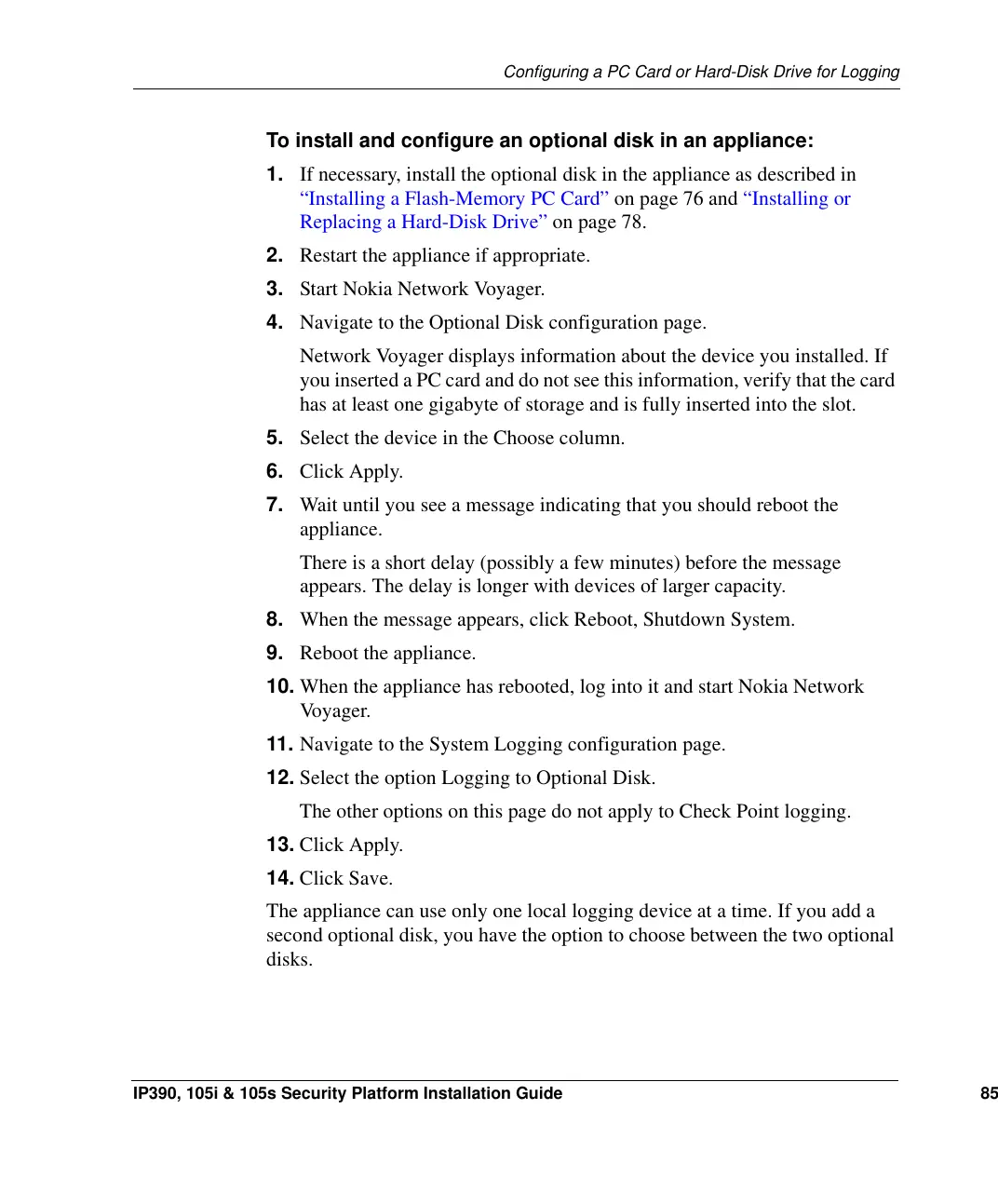 1. If necessary, install the optional disk in the appliance as described in