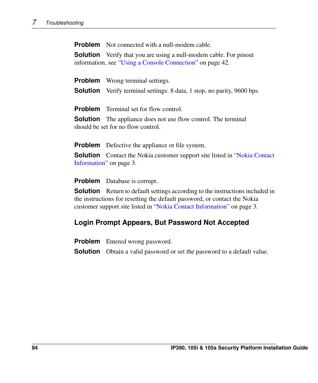 Solution Verify terminal settings: 8 data, 1 stop, no parity, 9600 bps.