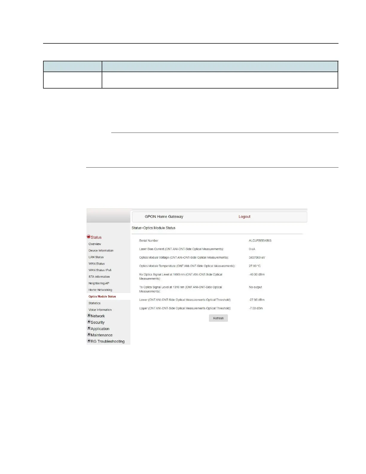 Click Status→Optics Module Status from the left pane in the GPON Home Gateway page.