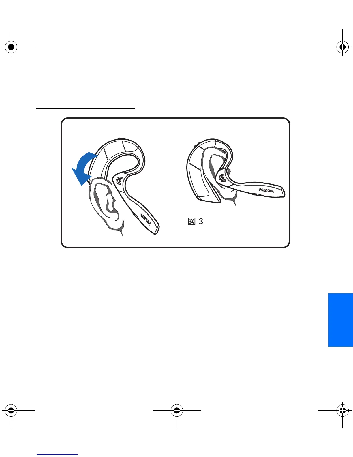 3 に示すように、ヘッドセットを耳の上に滑らせます。