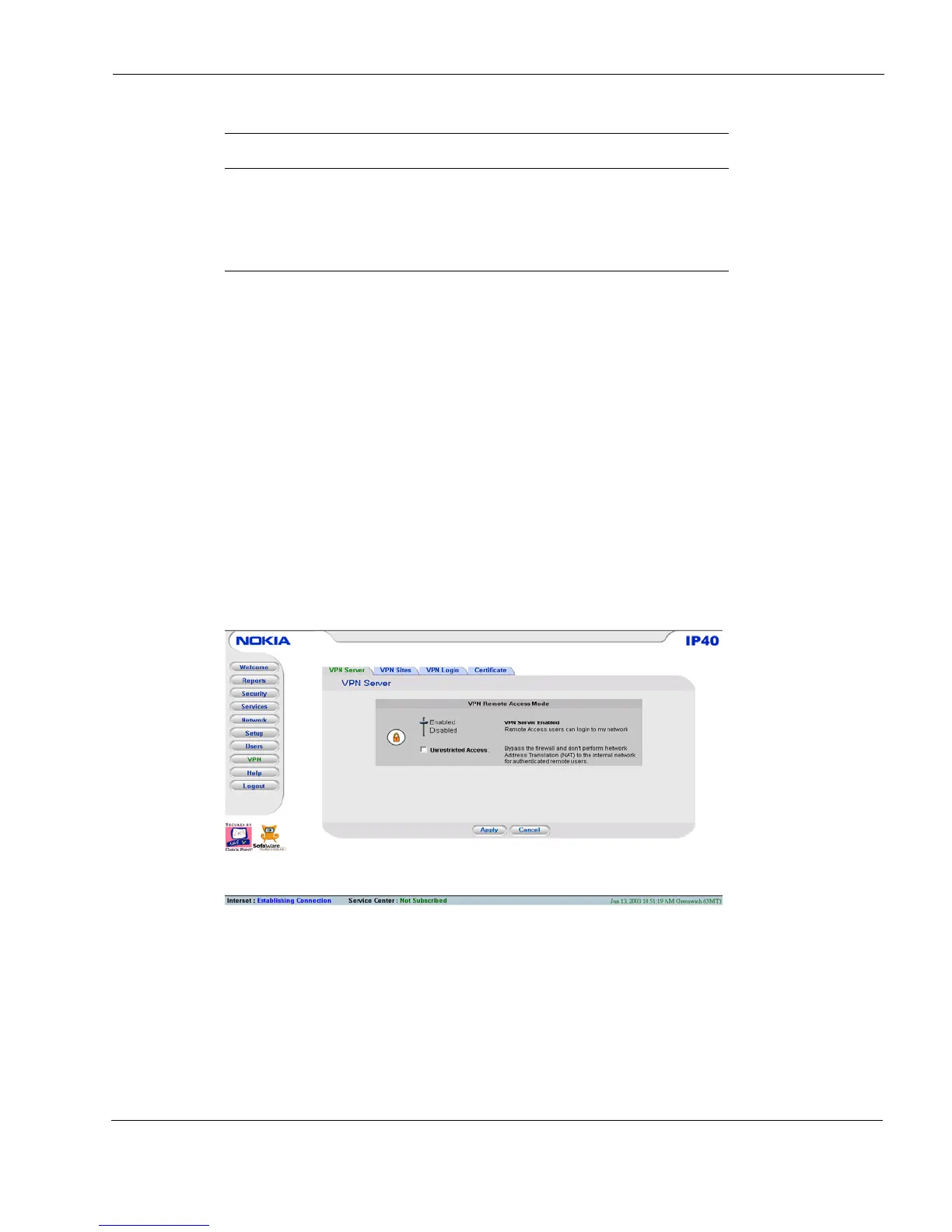 authorized users by setting up your Nokia IP40 as a VPN server. Remote access users can