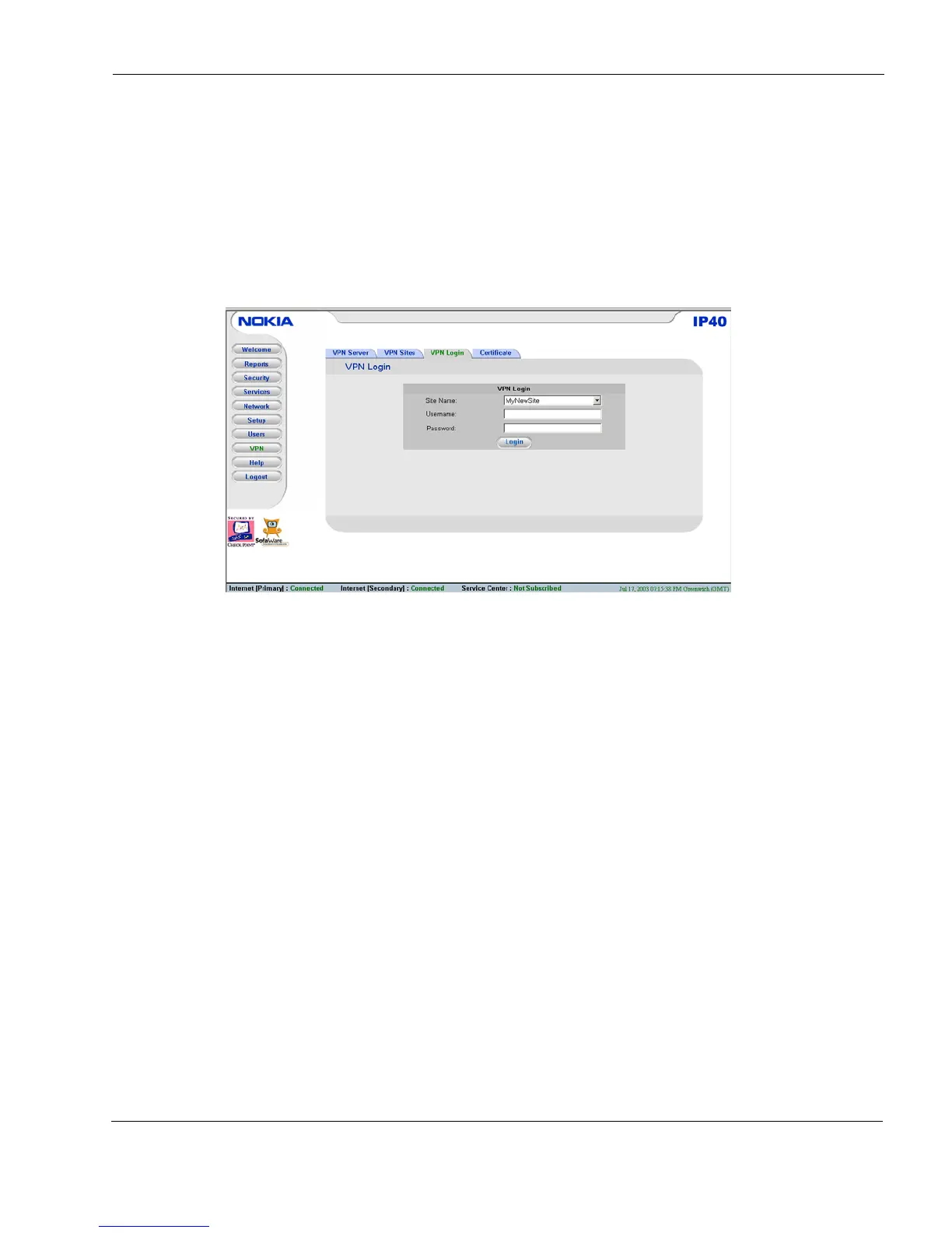To log on to a VPN site from the Nokia IP40 GUI, do the following: