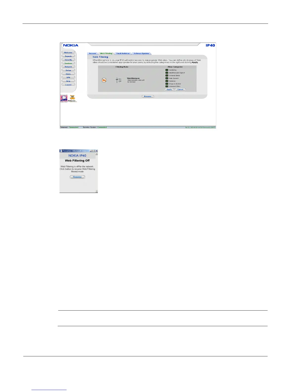 3. To re-enable the service, click Resume, either in the popup window, or on the Web Filtering