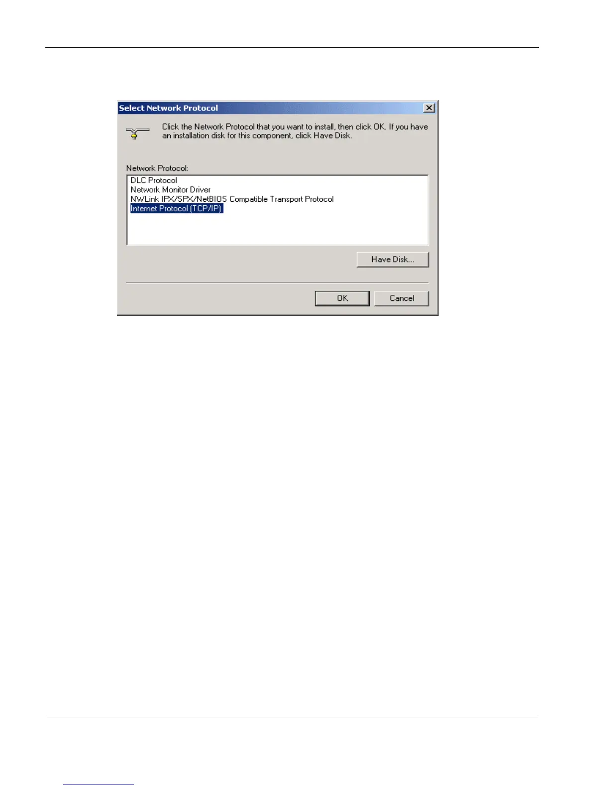 3. In the Select Network Protocol window, choose Internet Protocol (TCP/IP) and click OK to