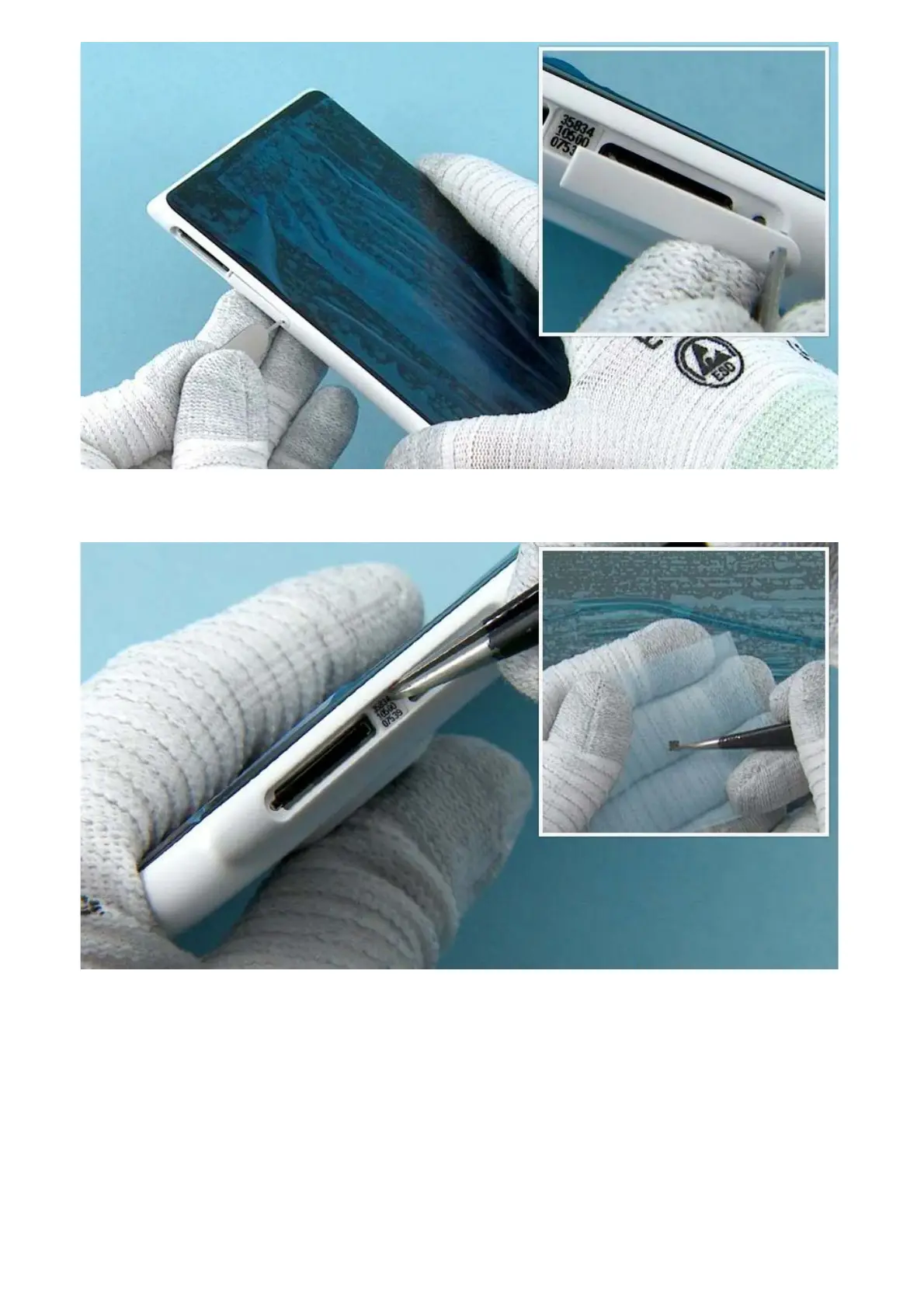 6) Use tweezers to remove the IMEI LABEL. Store the IMEI LABEL on non-stick surface so it can be re-