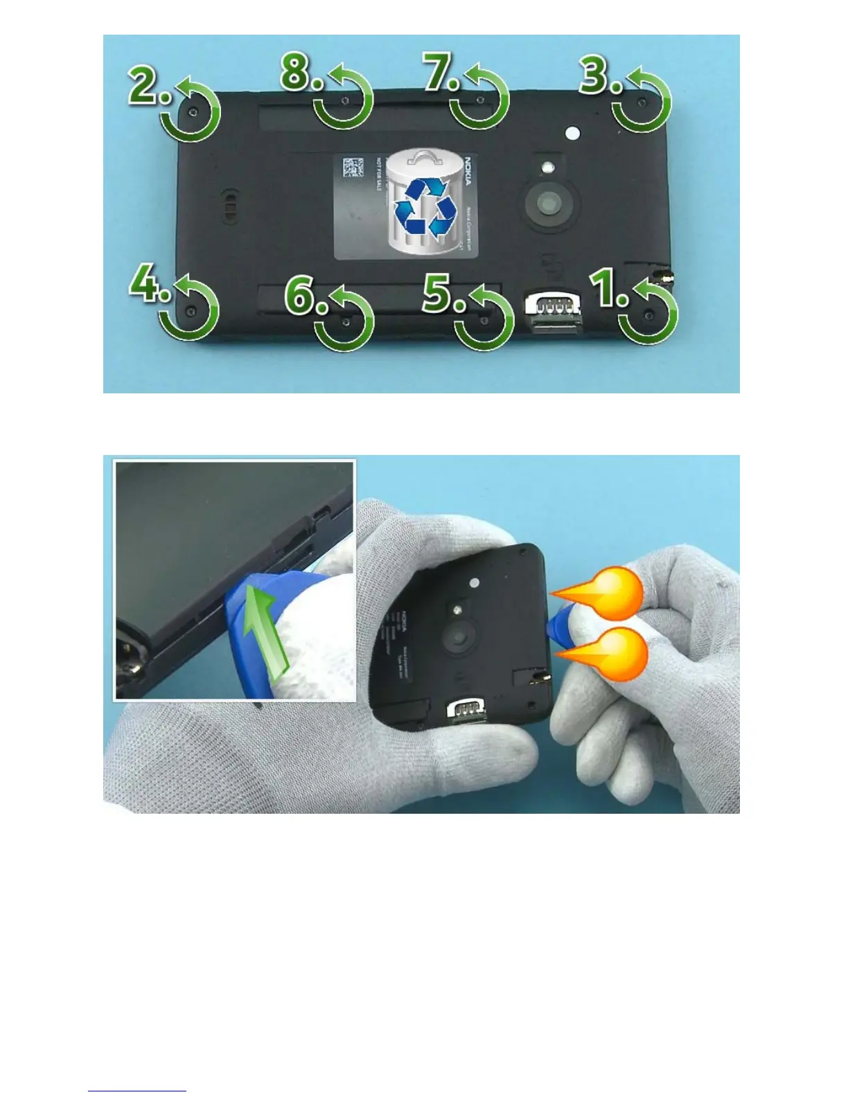 5) Unscrew the eight Torx+ size 5 screws in the order shown. Do not use the screws again. Discard them.