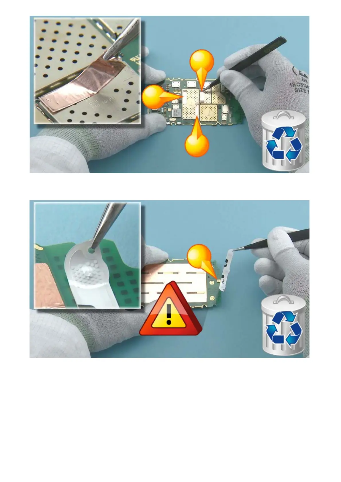 Remove the three shown SHIELD ADHESIVES with tweezers. Do not use them again. Discard them.