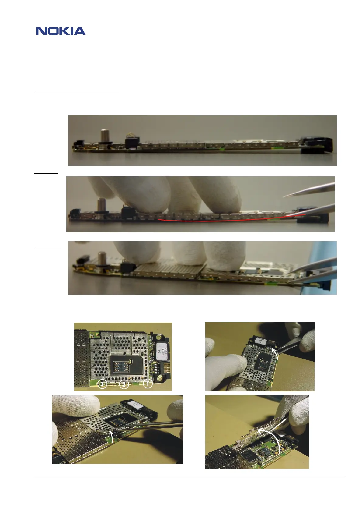 For disassembly it is important to lay the PWB on a plane underground so that the bottom connector is hanging free to prevent