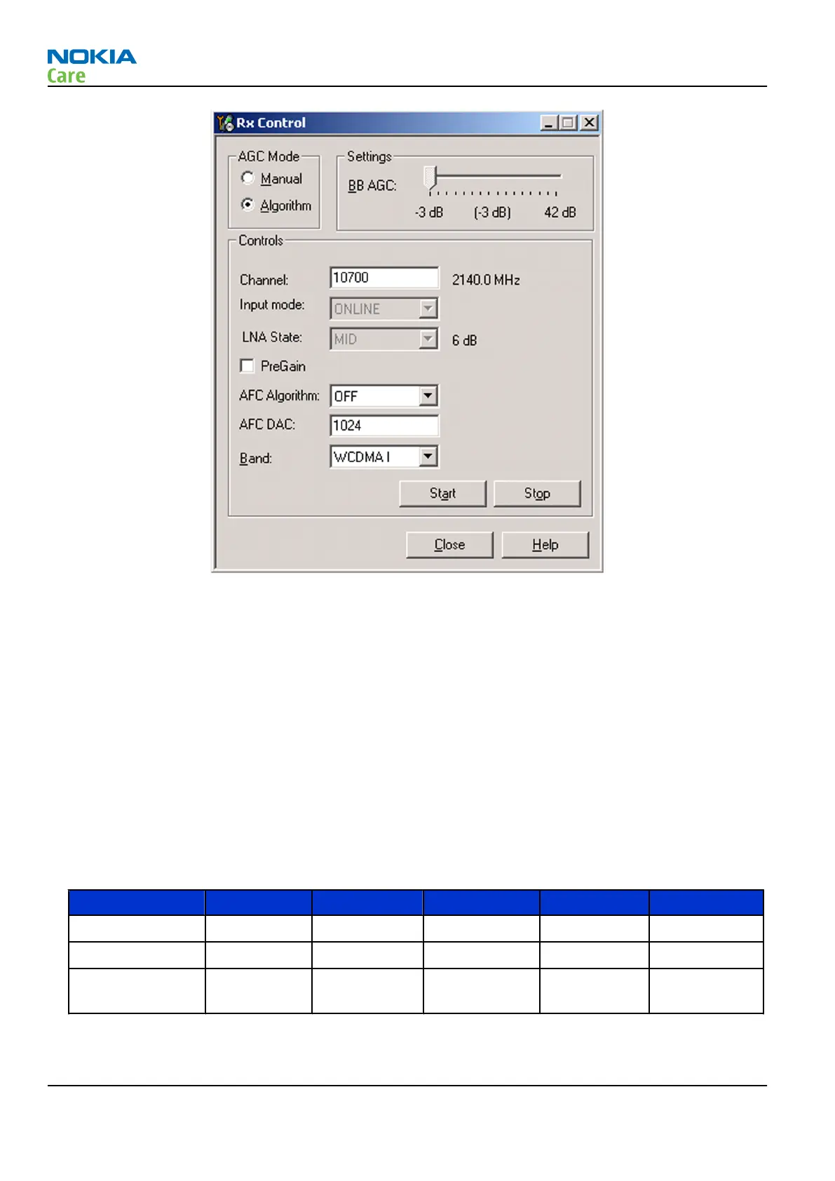 4. Click Start to activate the WCDMA RX. If the settings are changed later on (for example, change of channel)