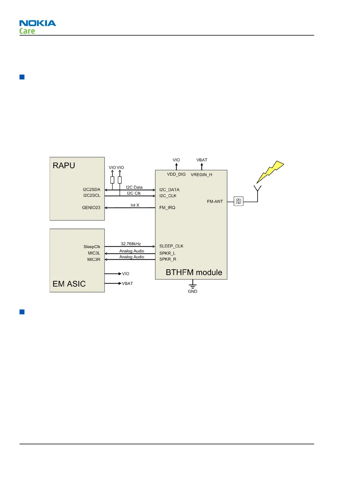 The BTHFM module is powered by VBAT and the regulated voltage VIO. For audio applications the Bluetooth