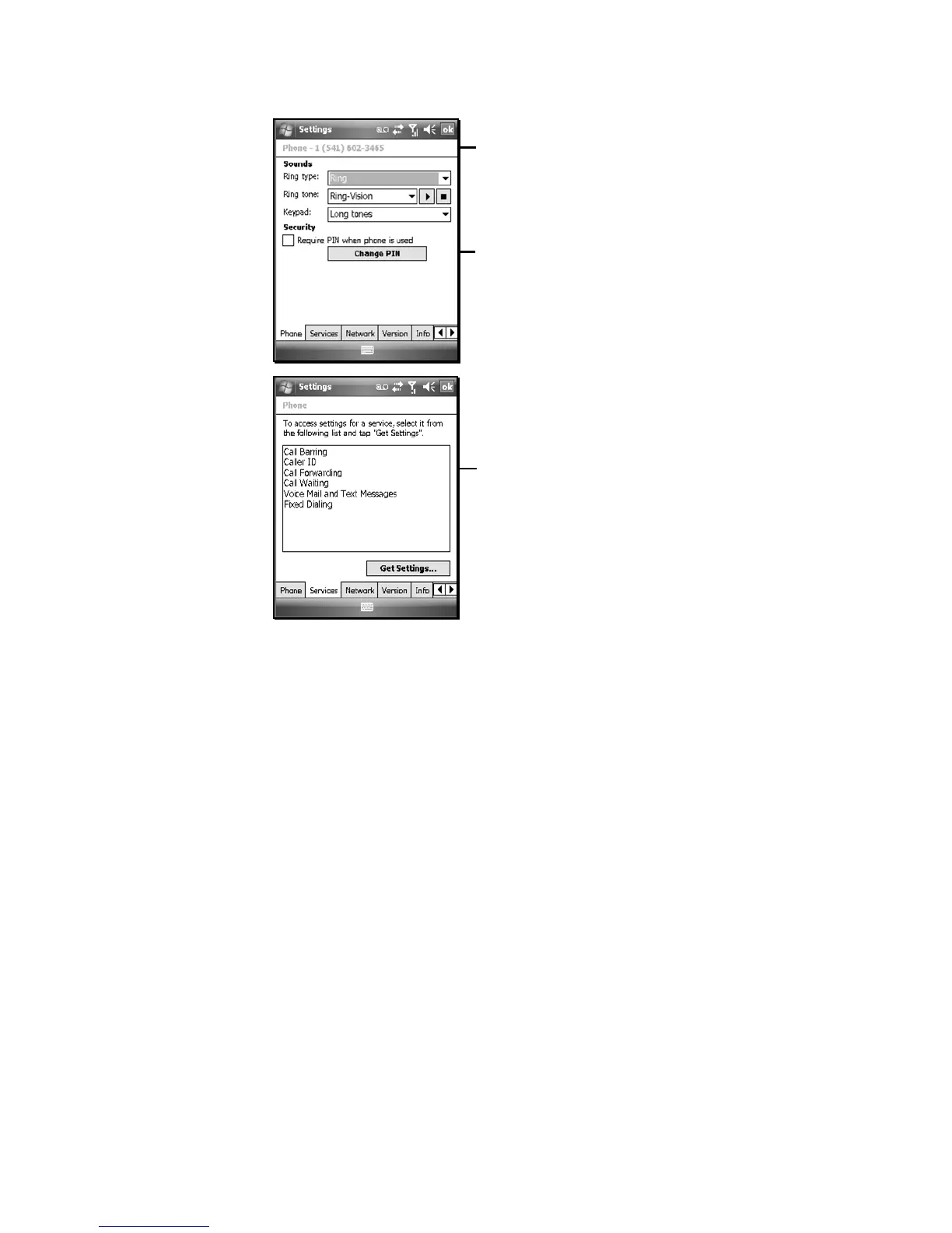 Tap Start / Settings / Phone. The following settings are described