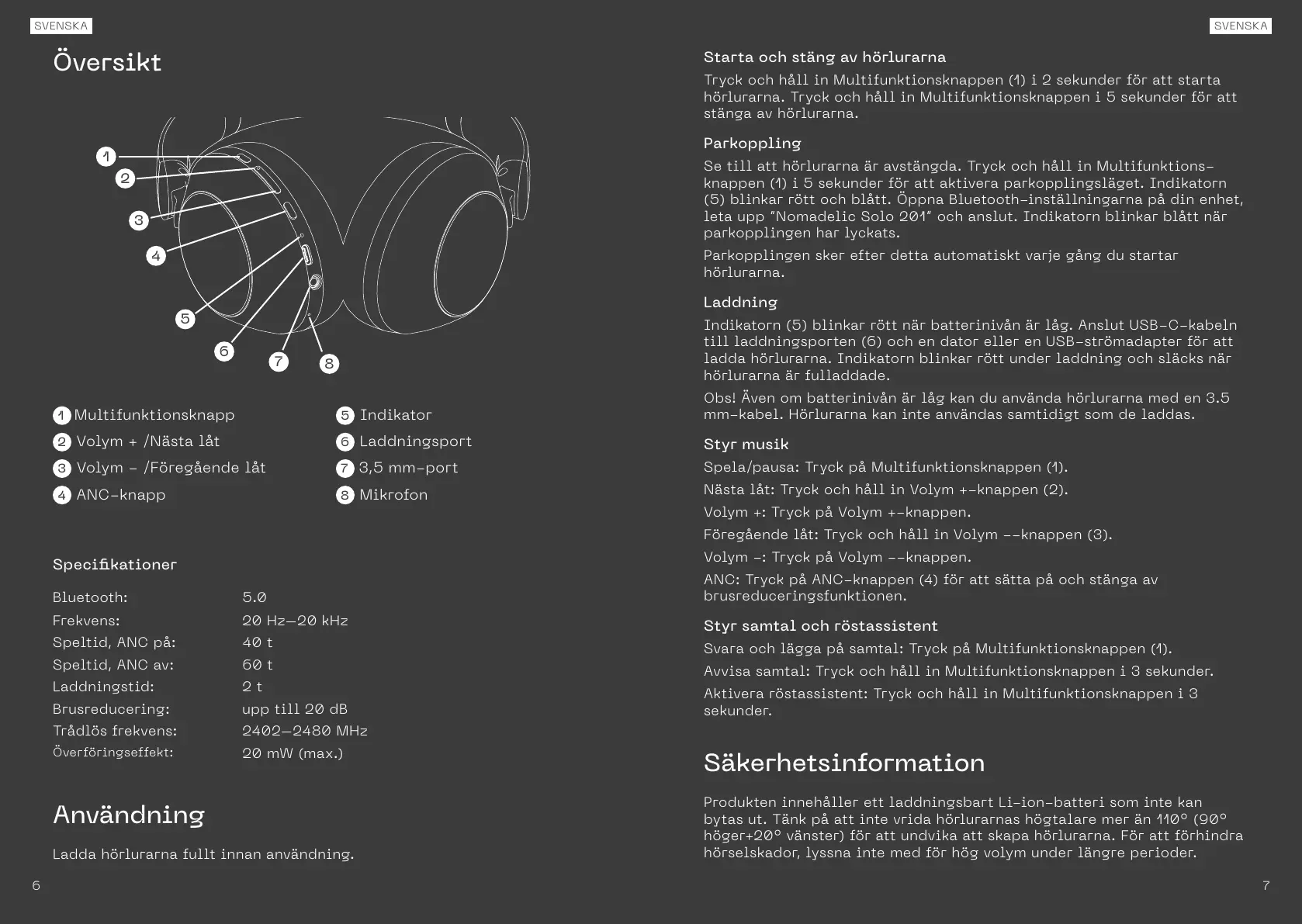 ANC: Tryck på ANC-knappen (4) för att sätta på och stänga av