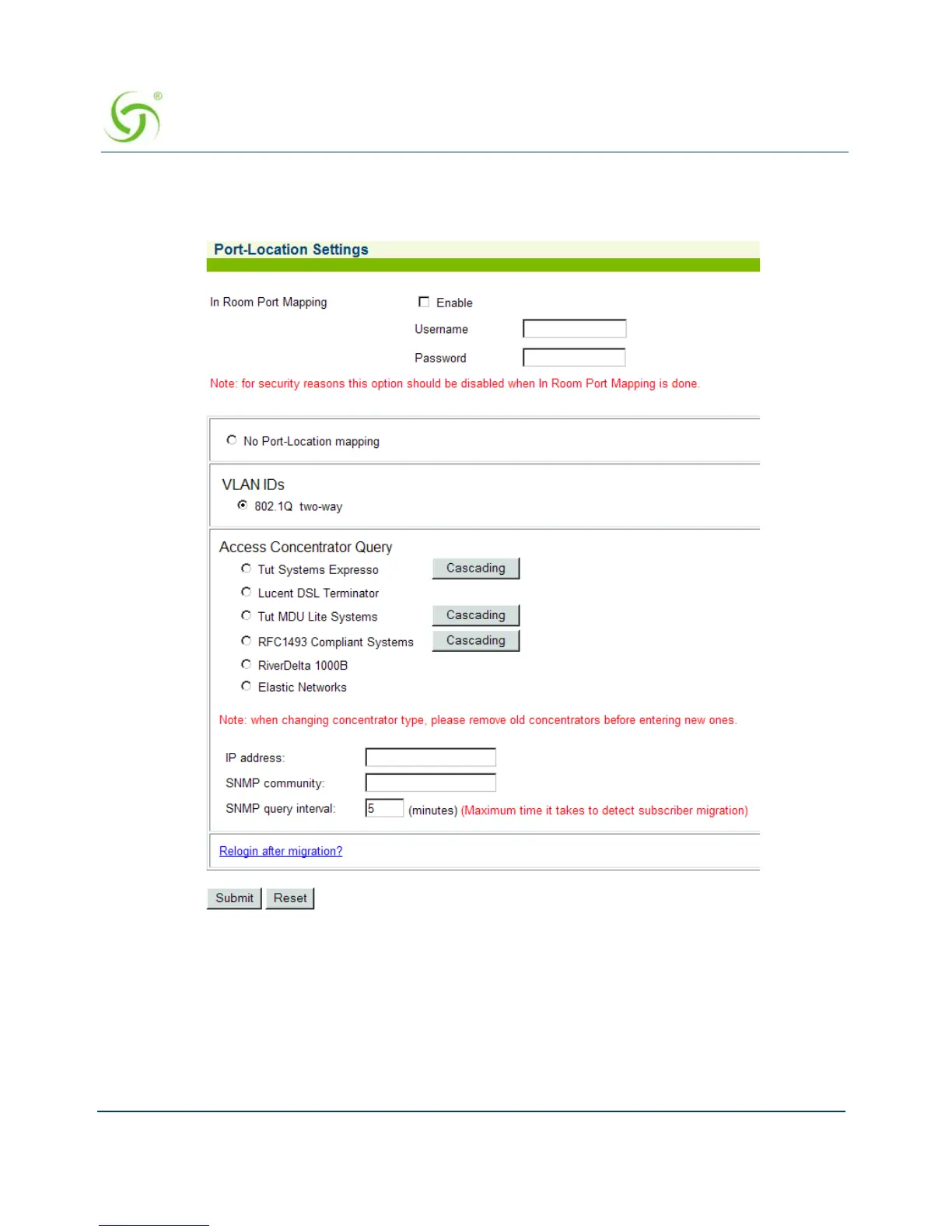 Port-Location Settings screen appears: