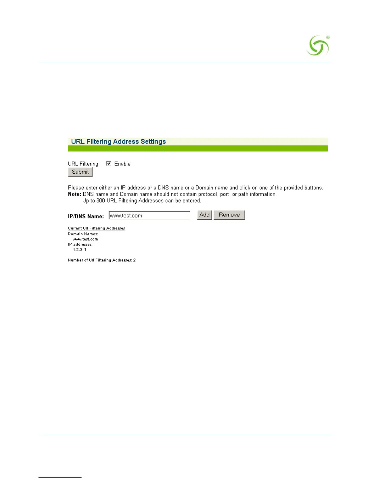 4. If URL Filtering is enabled, you can add (or remove) up to 300 addresses in the IP/DNS