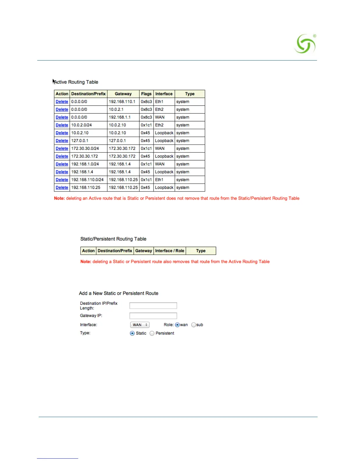Static/Persistent Routing Table, grouped in a separate section for easy reference and