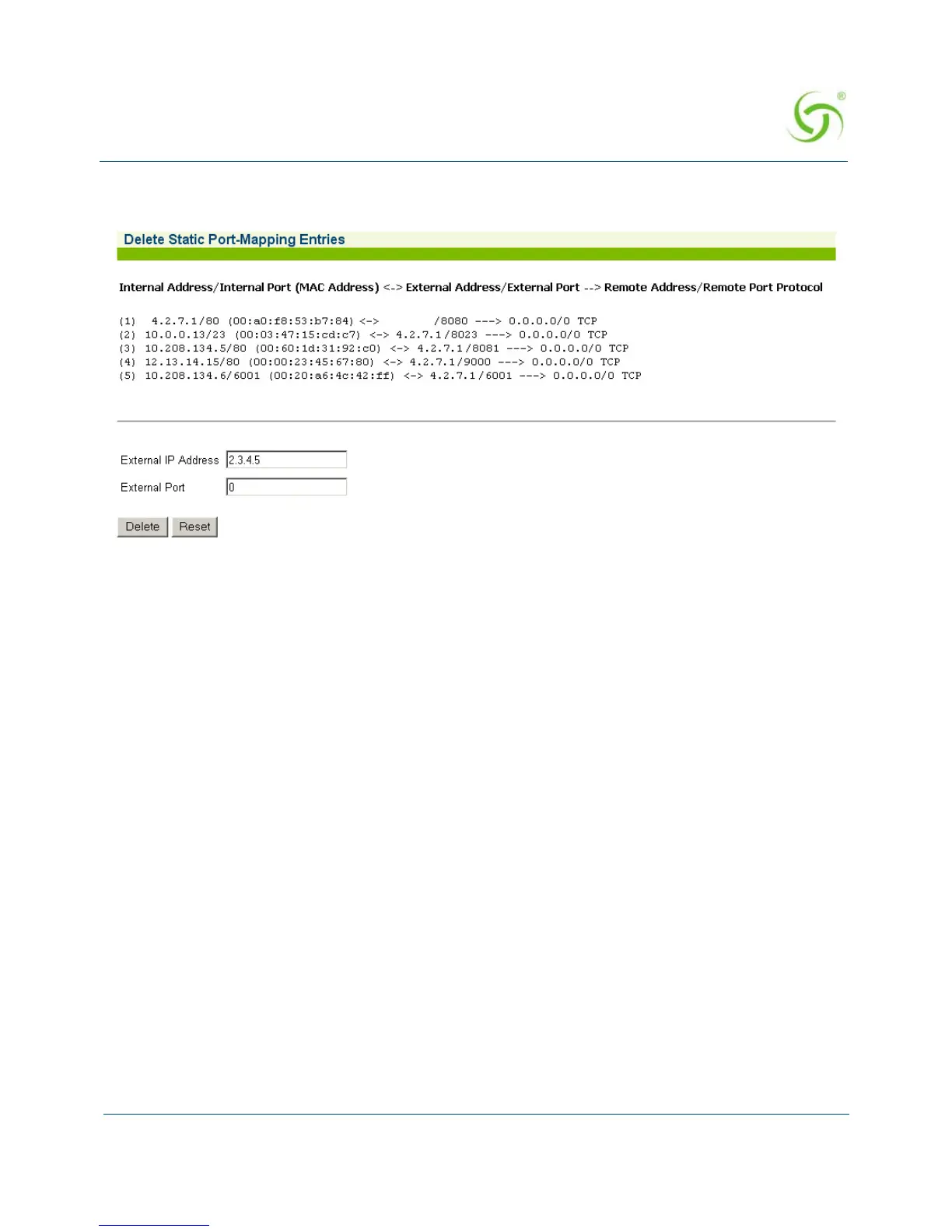 The Delete Static Port-Mapping Entries screen appears: