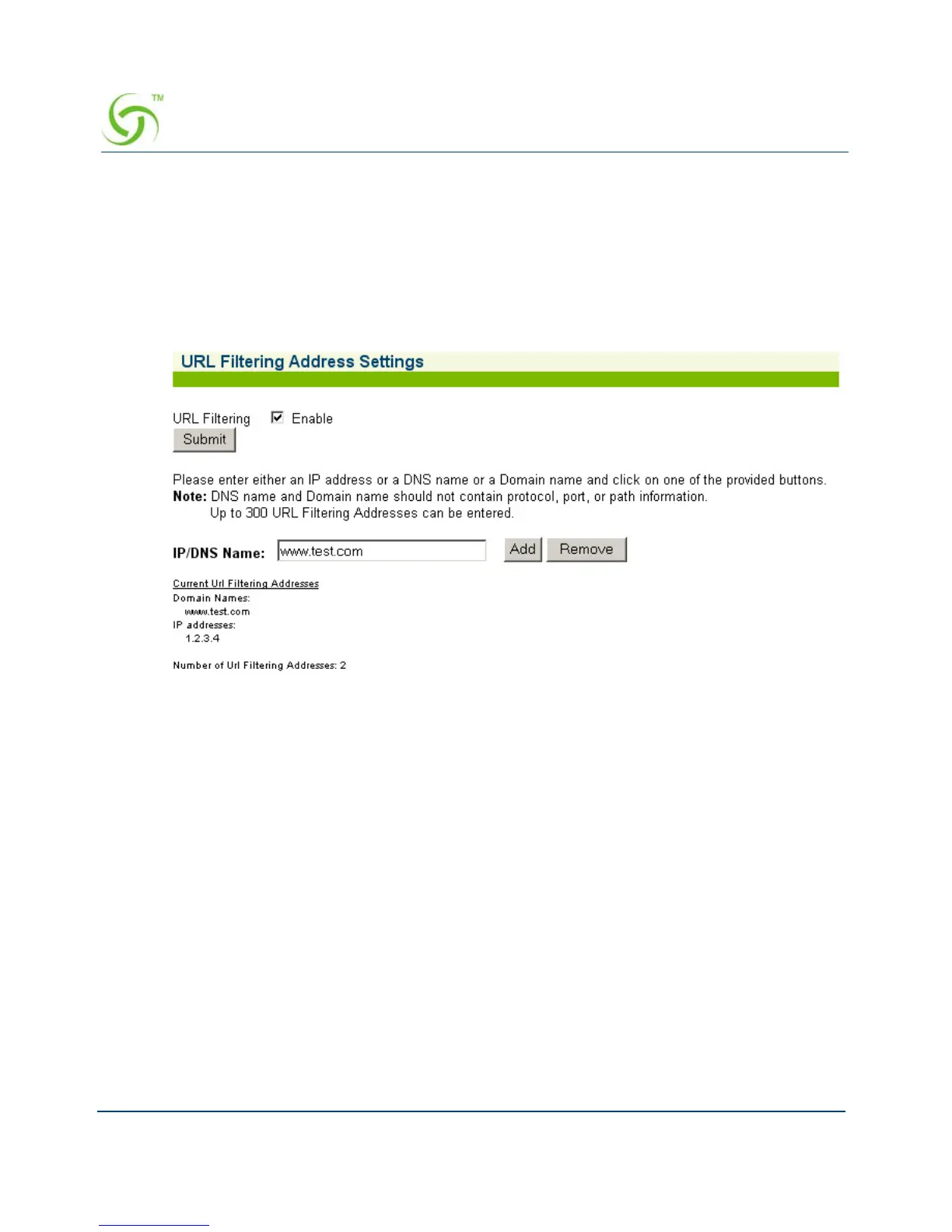 4. If URL Filtering is enabled, you can add (or remove) up to 300 addresses in the IP/DNS