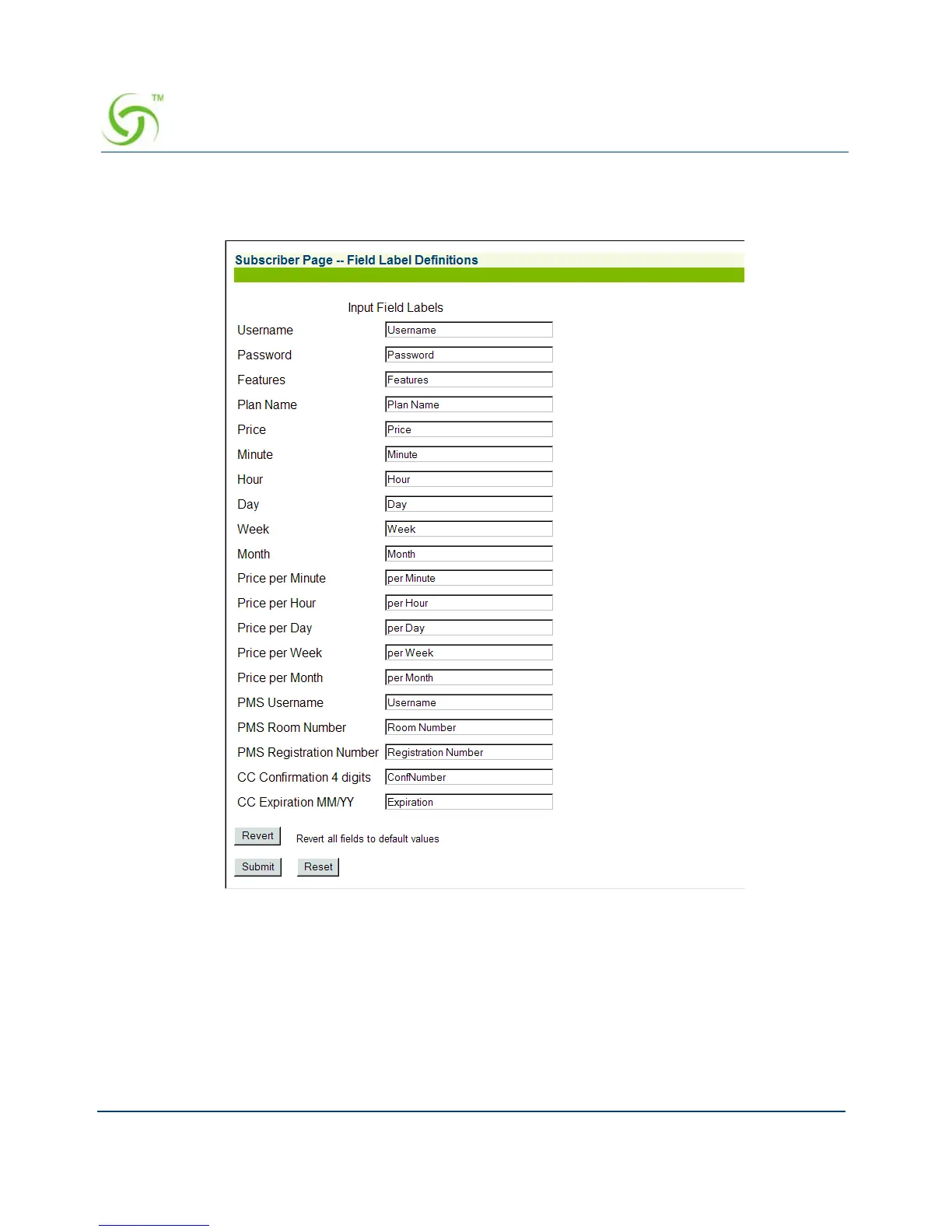 Labels. The Subscriber Page -- Field Label Definitions screen appears: