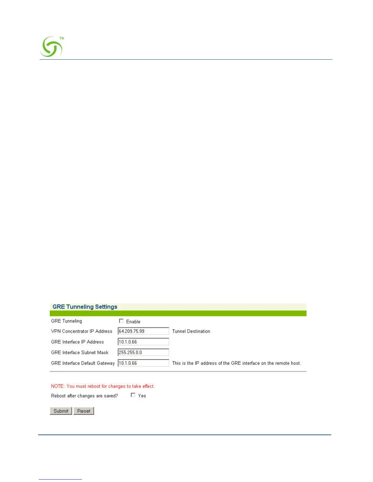 Submit to save the settings or Reset to clear the changes and return