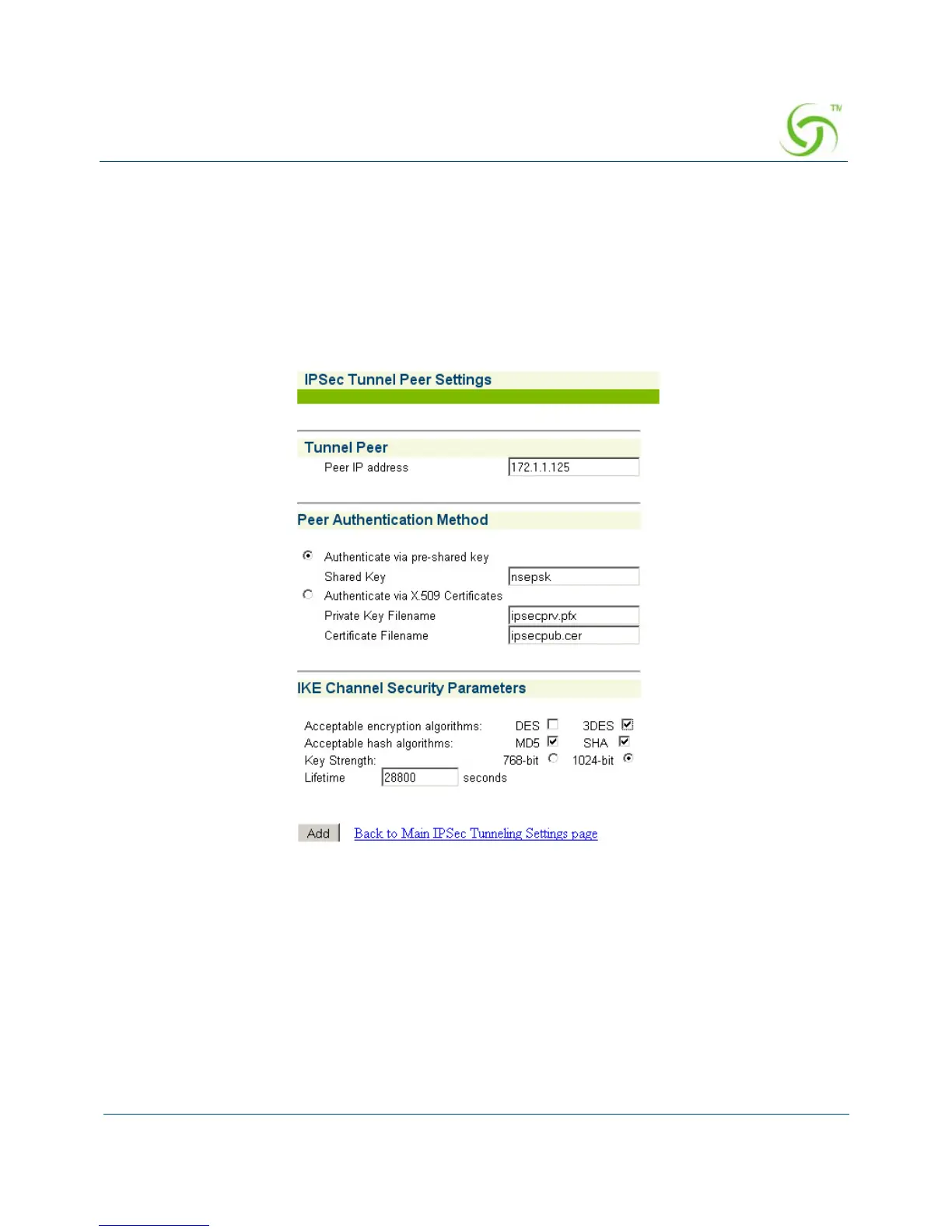 1. Click the Add button in the IPSec Tunnel Peers table. The IPSec Tunnel Peer Settings