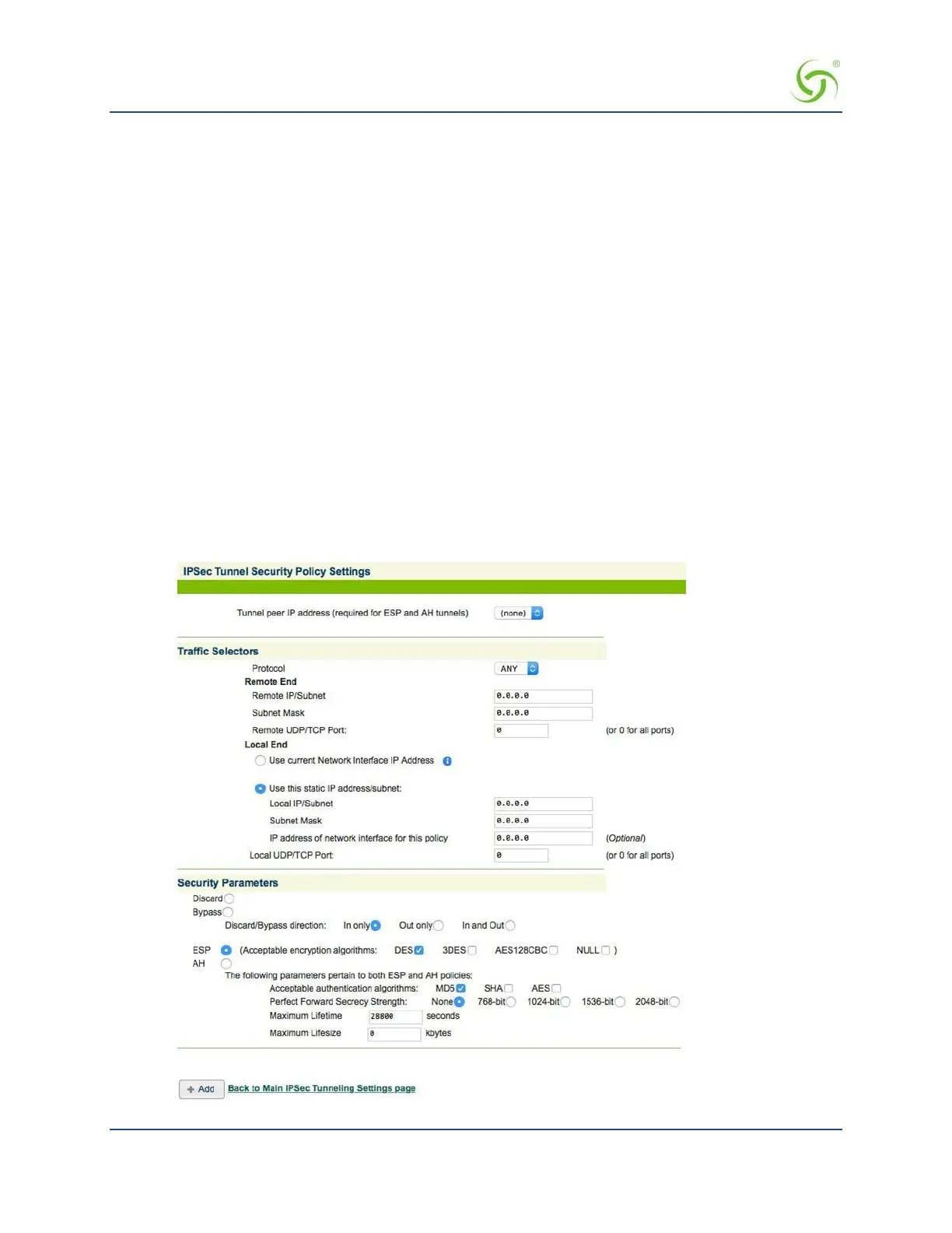 In the IPSec Security Policies table, click the Add button to add an entry. The IPsec Tunnel Security