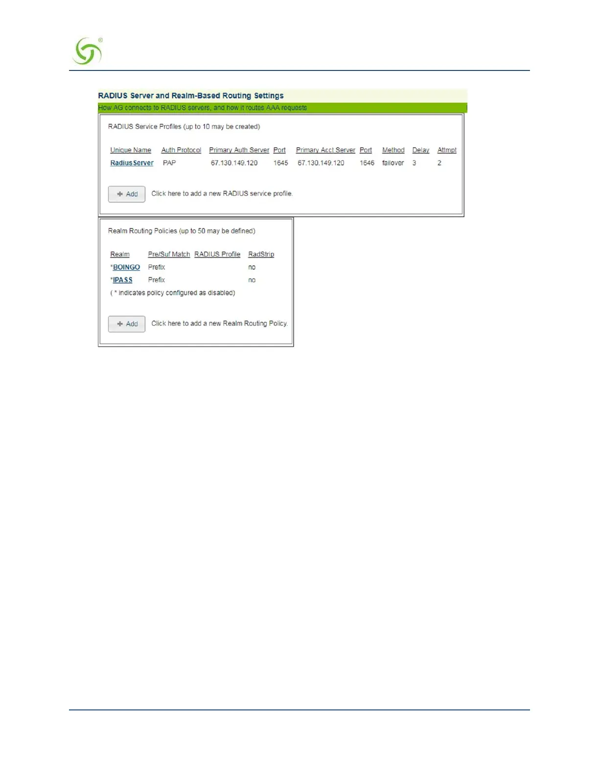 To add a RADIUS Service Profile, click on the appropriate