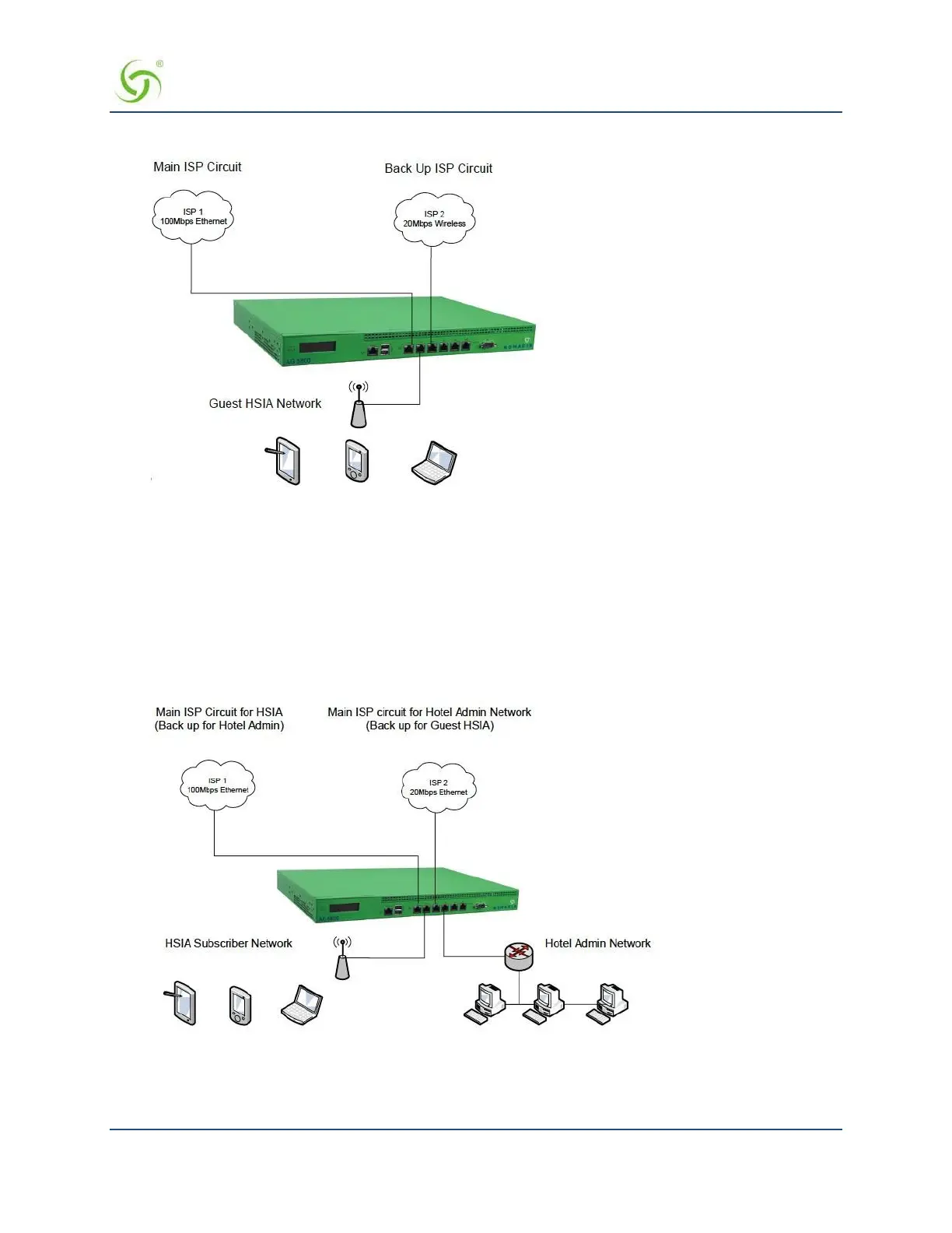 In this scenario, the hotel has separate HSIA and Hotel Admin ISP circuits. Under normal circumstances,