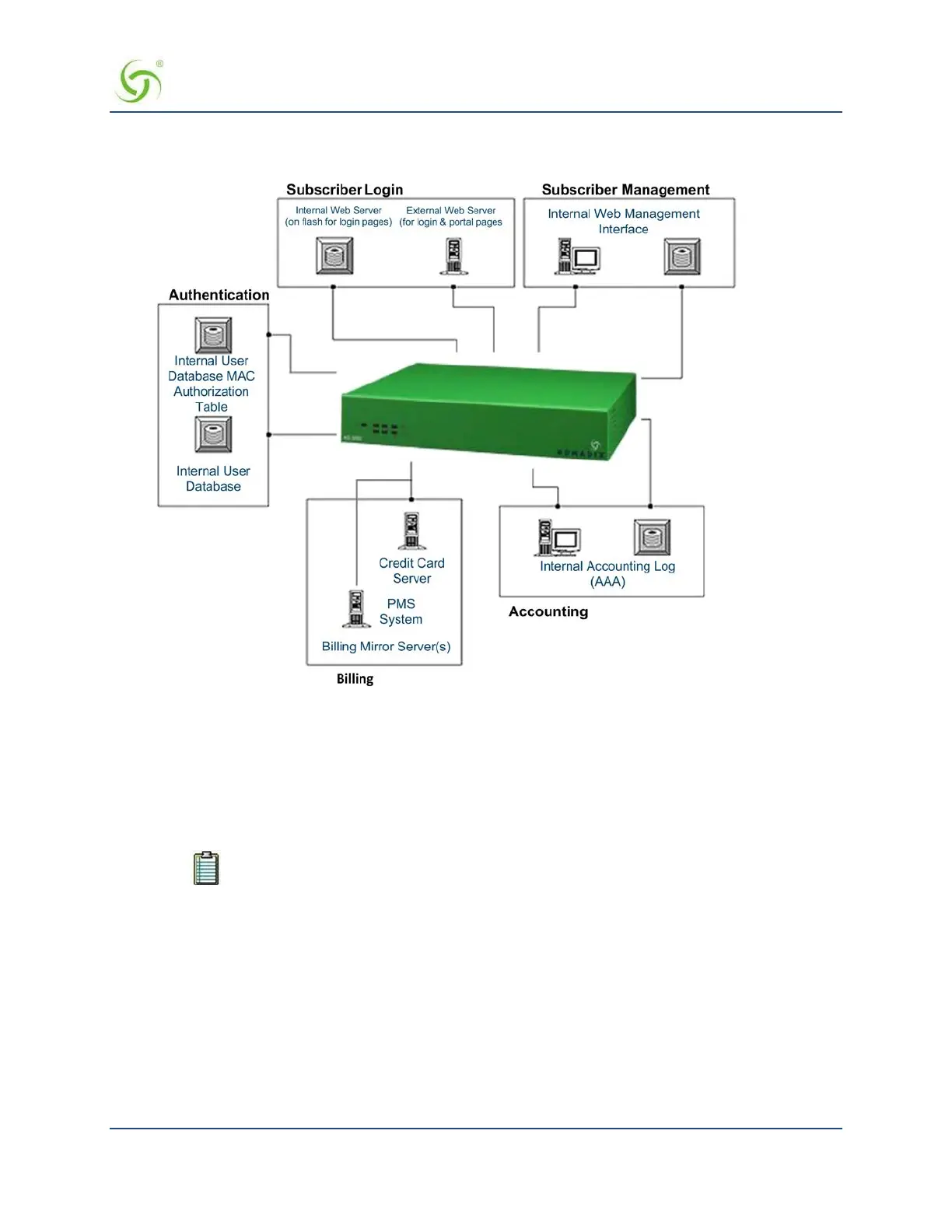 The following illustration shows the functional relationship between the Access Gateway’s internal modules