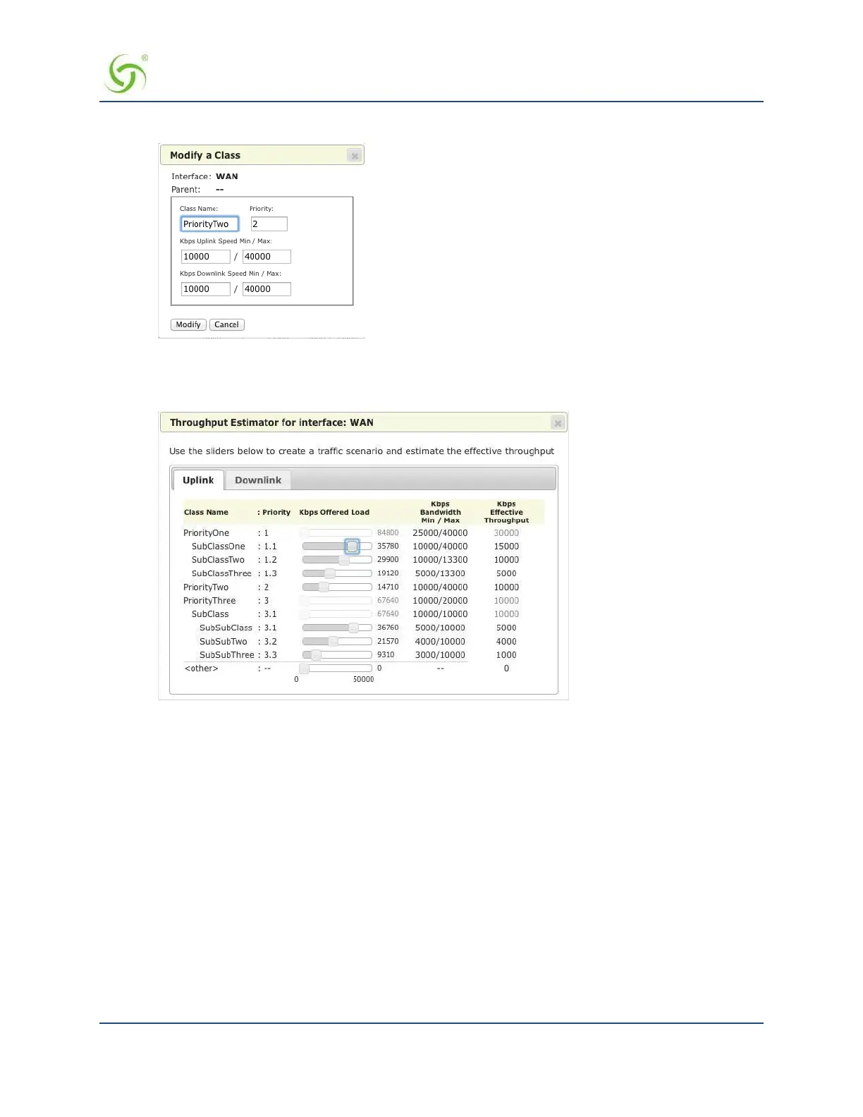 Click Throughput Estimator to evaluate traffic scenarios. Given different loads per class, the interface