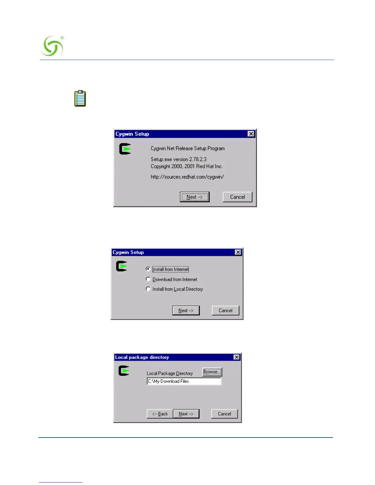 The procedure starts from the Cygwin Net Release Setup Program screen: