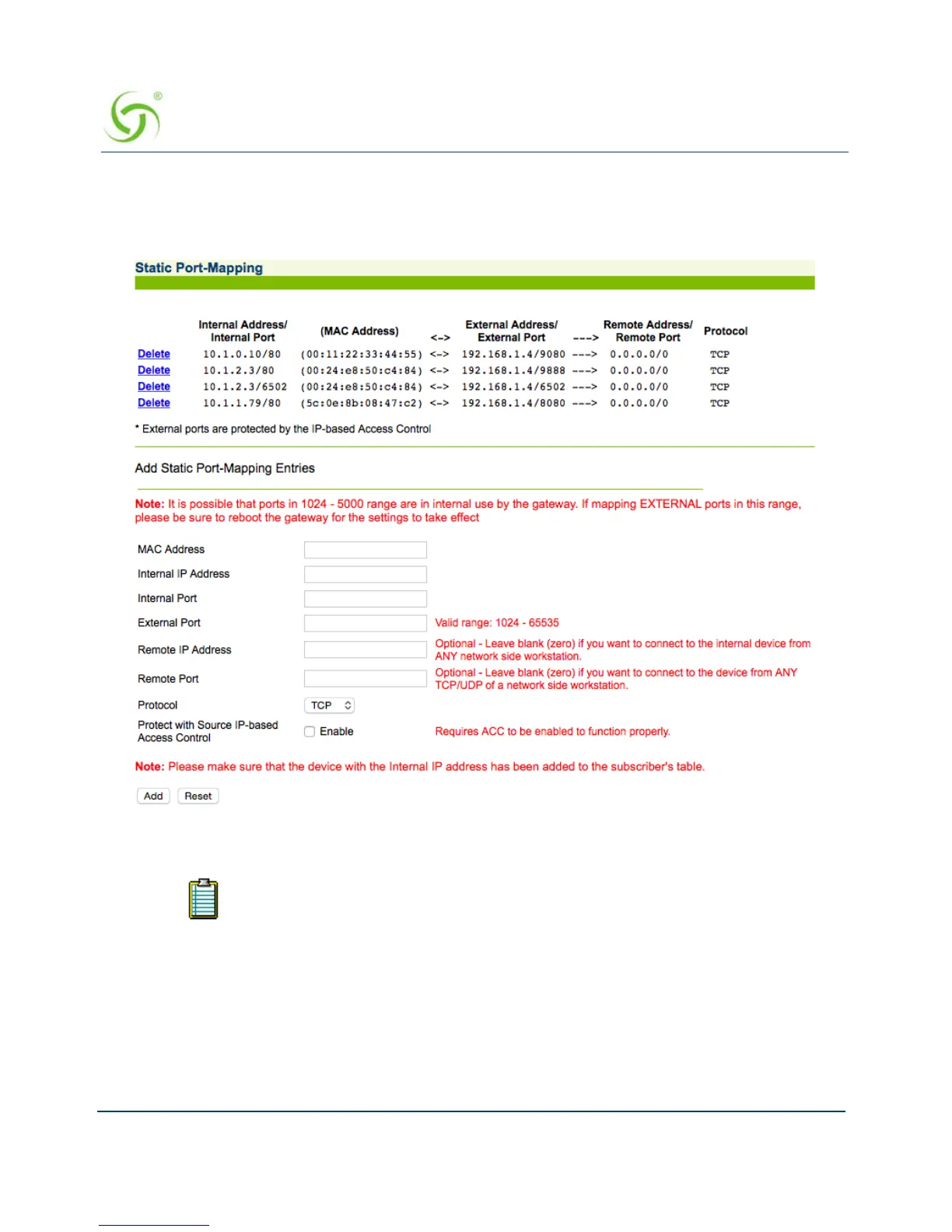 Static Port-Mapping screen appears: