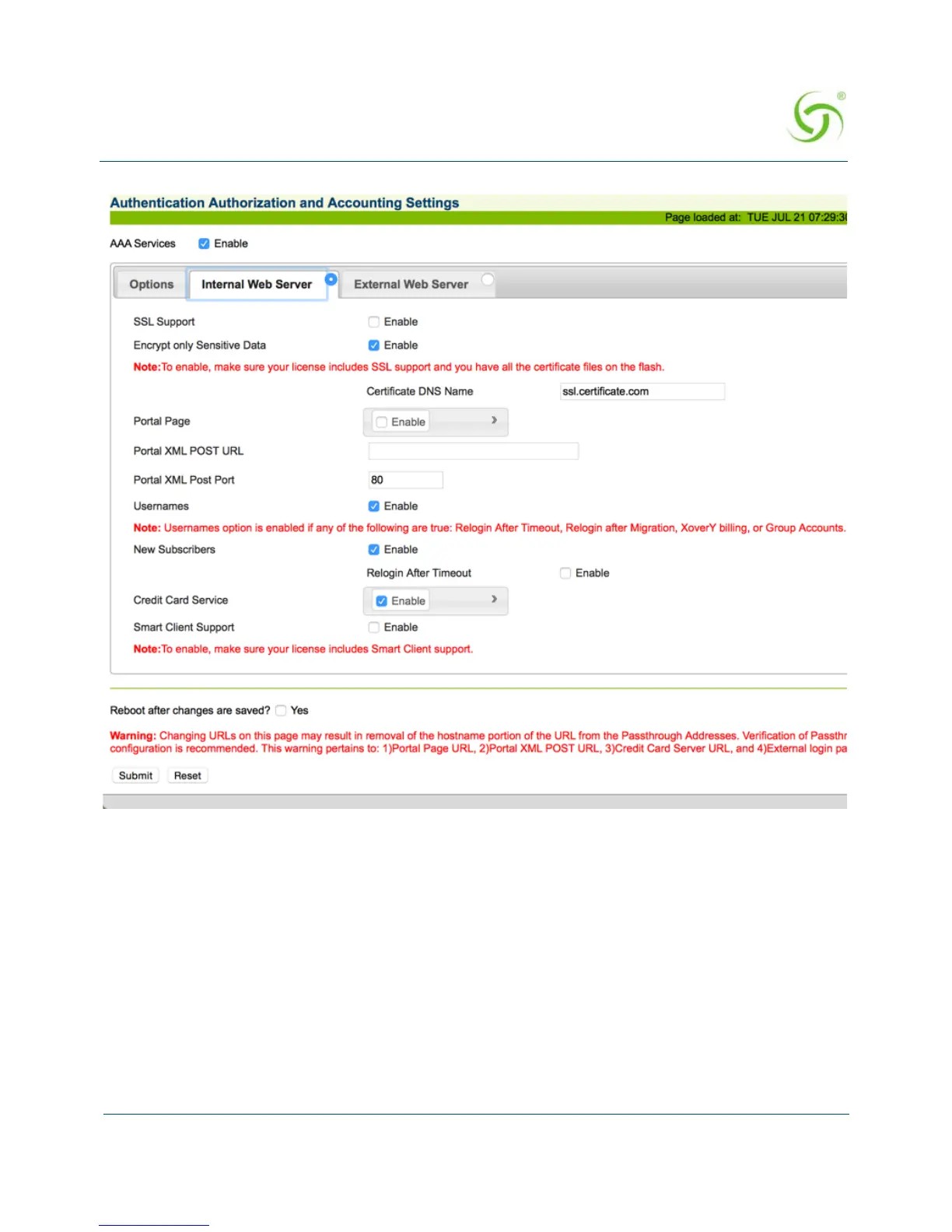 2. Enable or disable the SSL Support feature, as required. If you enable SSL Support, you