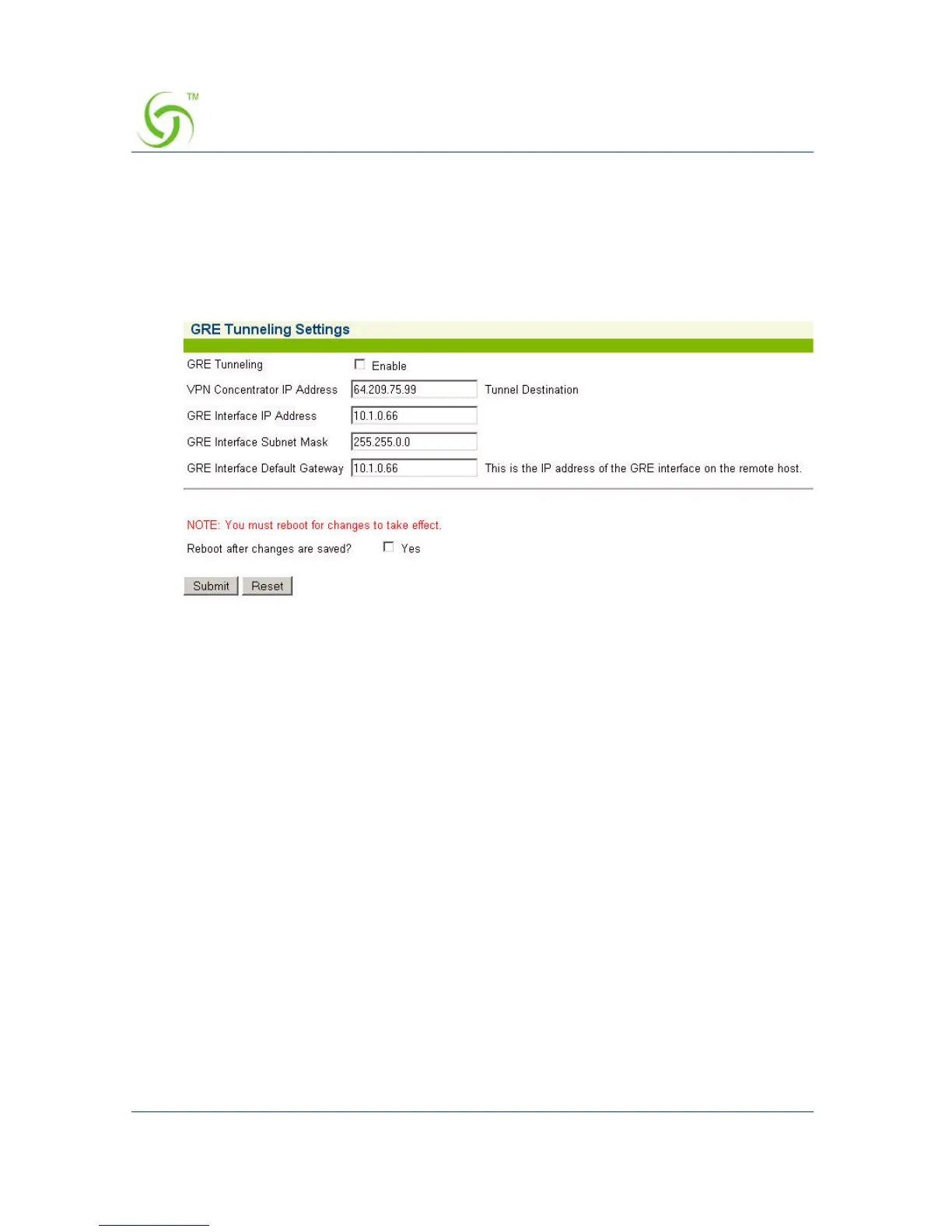 8. Click Submit to save your changes and reboot the system, or click Reset to reset