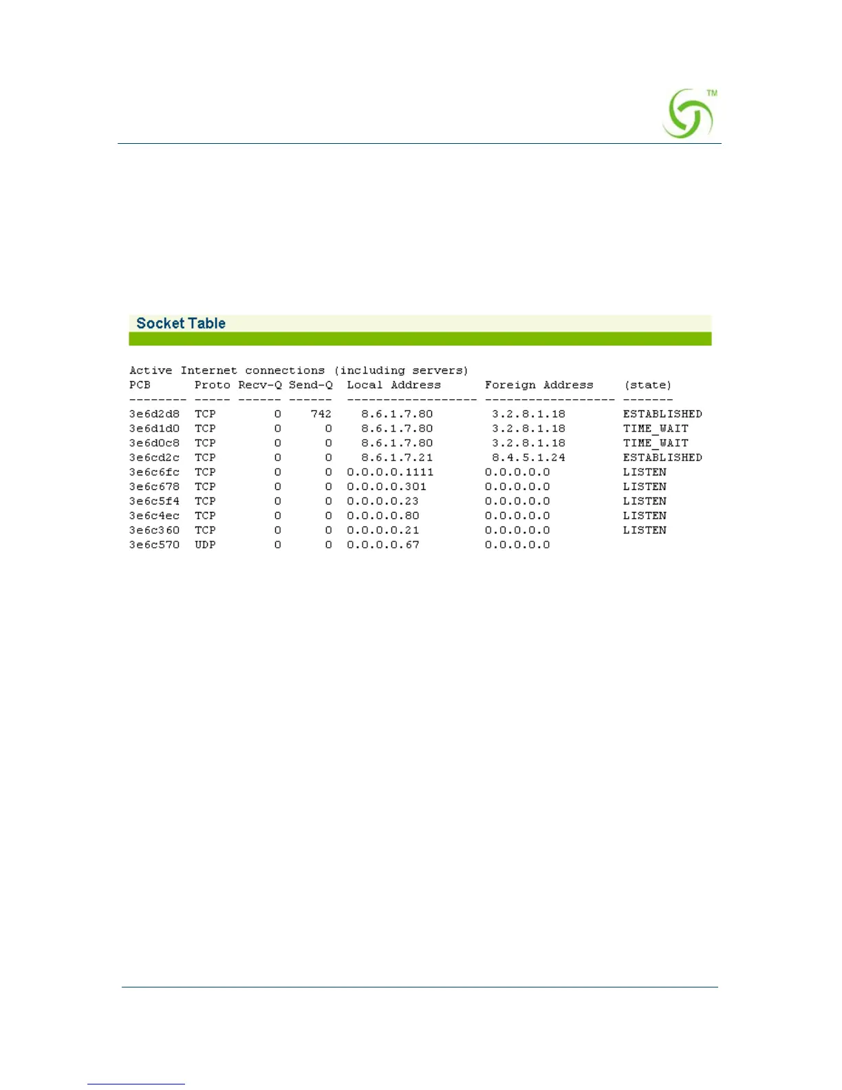 To view the Socket Table, go to the Web Management Interface, click on