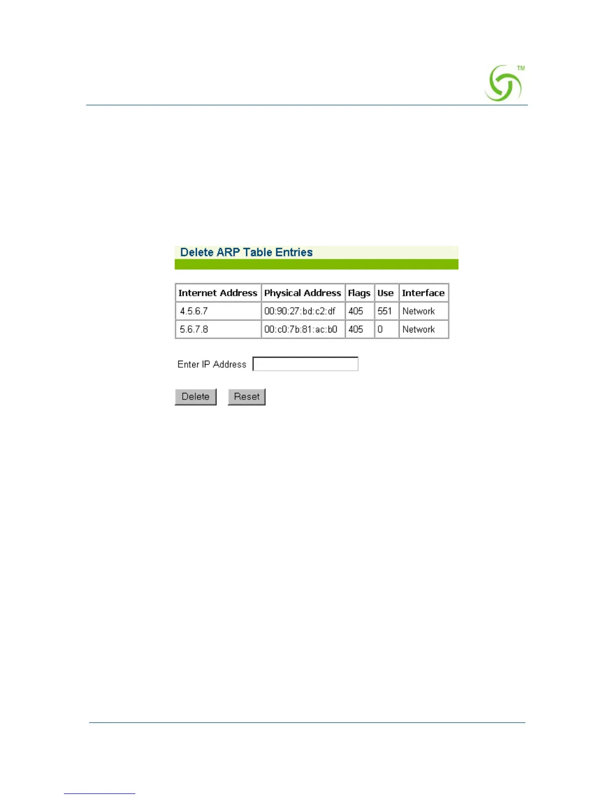 The Delete ARP Table Entries screen appears: