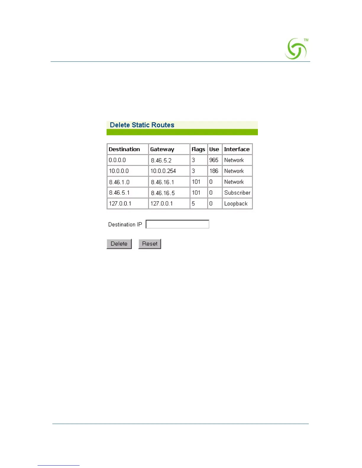2. Enter the Destination IP address of the route you want to delete from the routing