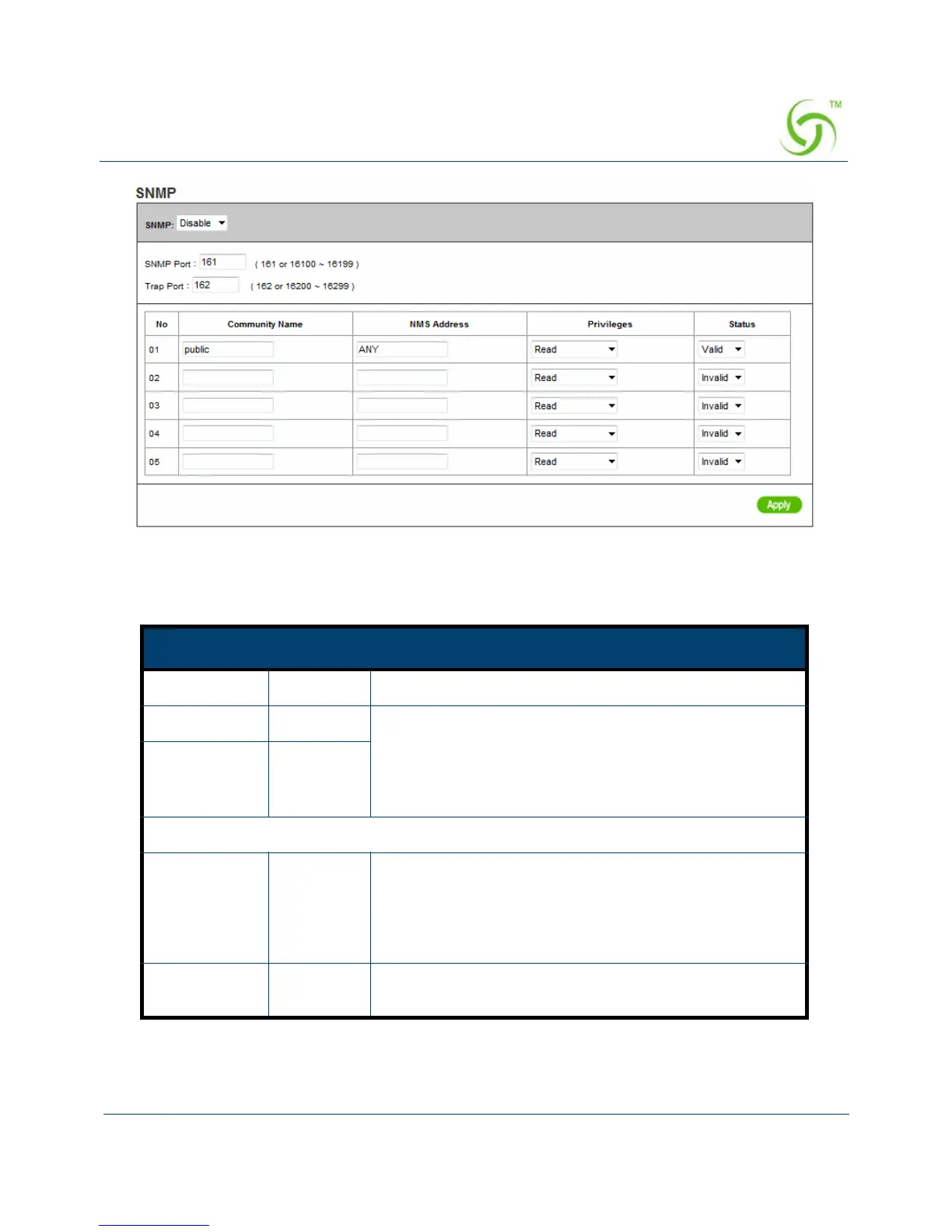 SNMP Port 161 If the SNMP is enabled, it can specify the SNMP port