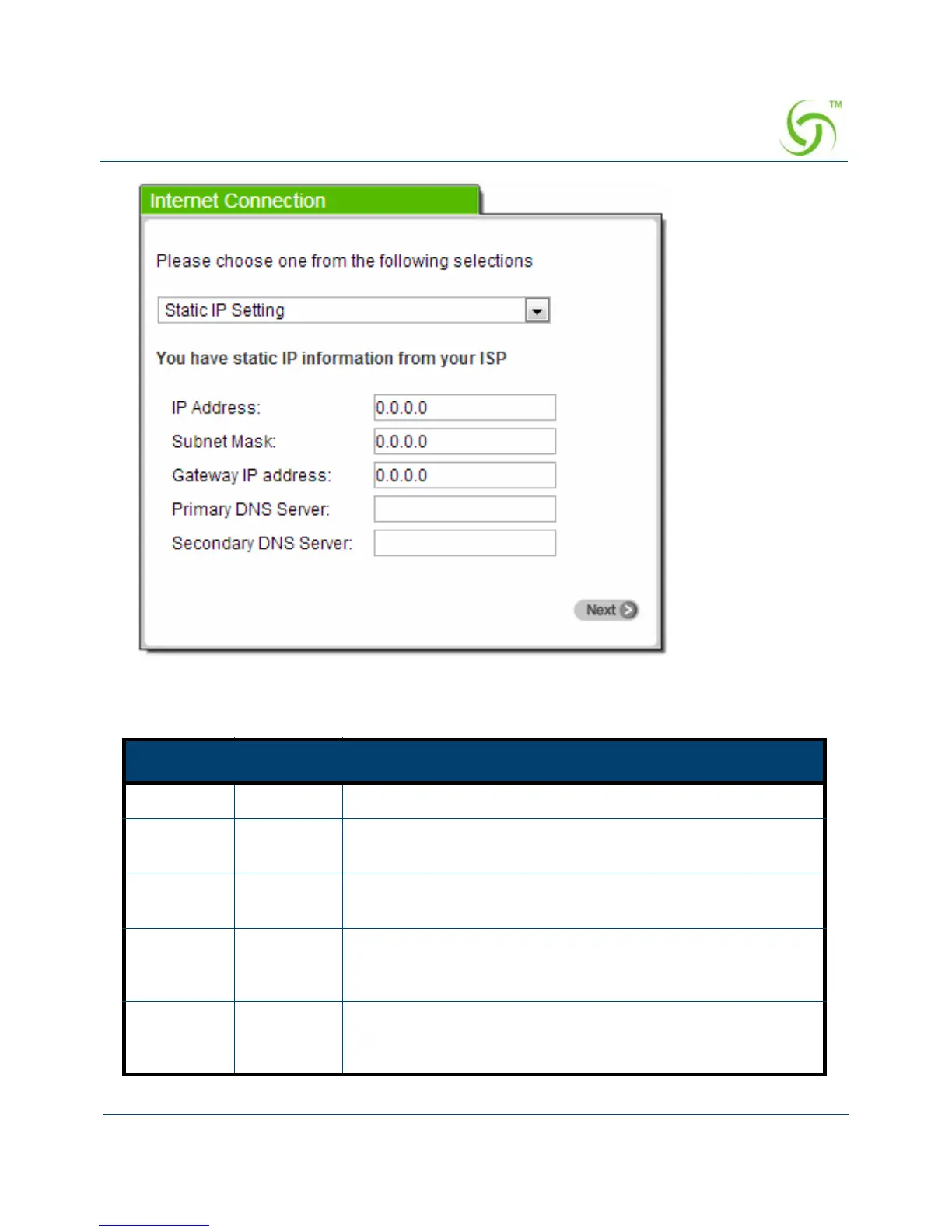 0.0.0.0 Enter the Gateway IP Address provided by your ISP.
