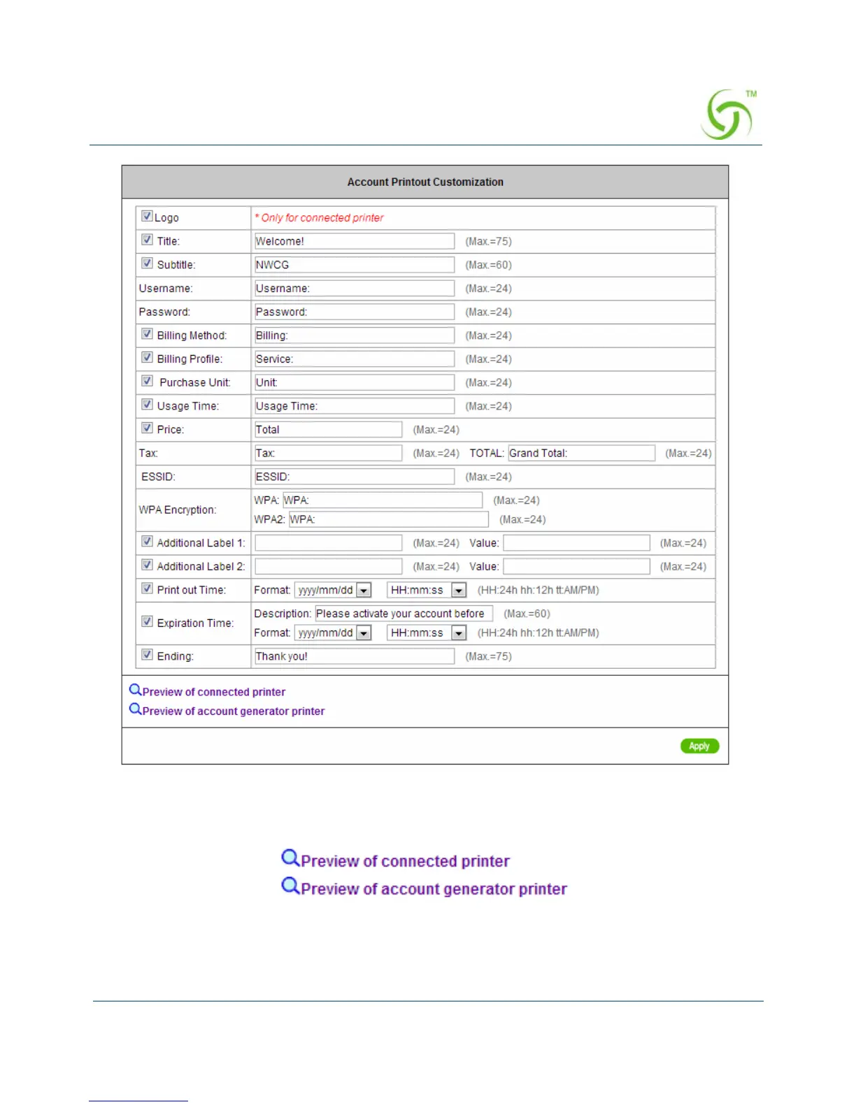 Figure 31 Customize Printout Text Setting Screen