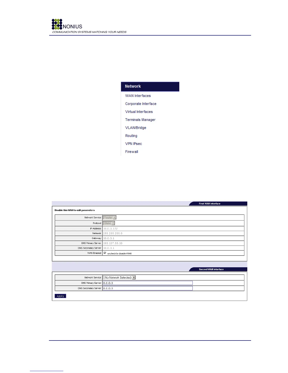 This menu allows the definition of network addresses, firewall‟s parameters, VLAN configuration,
