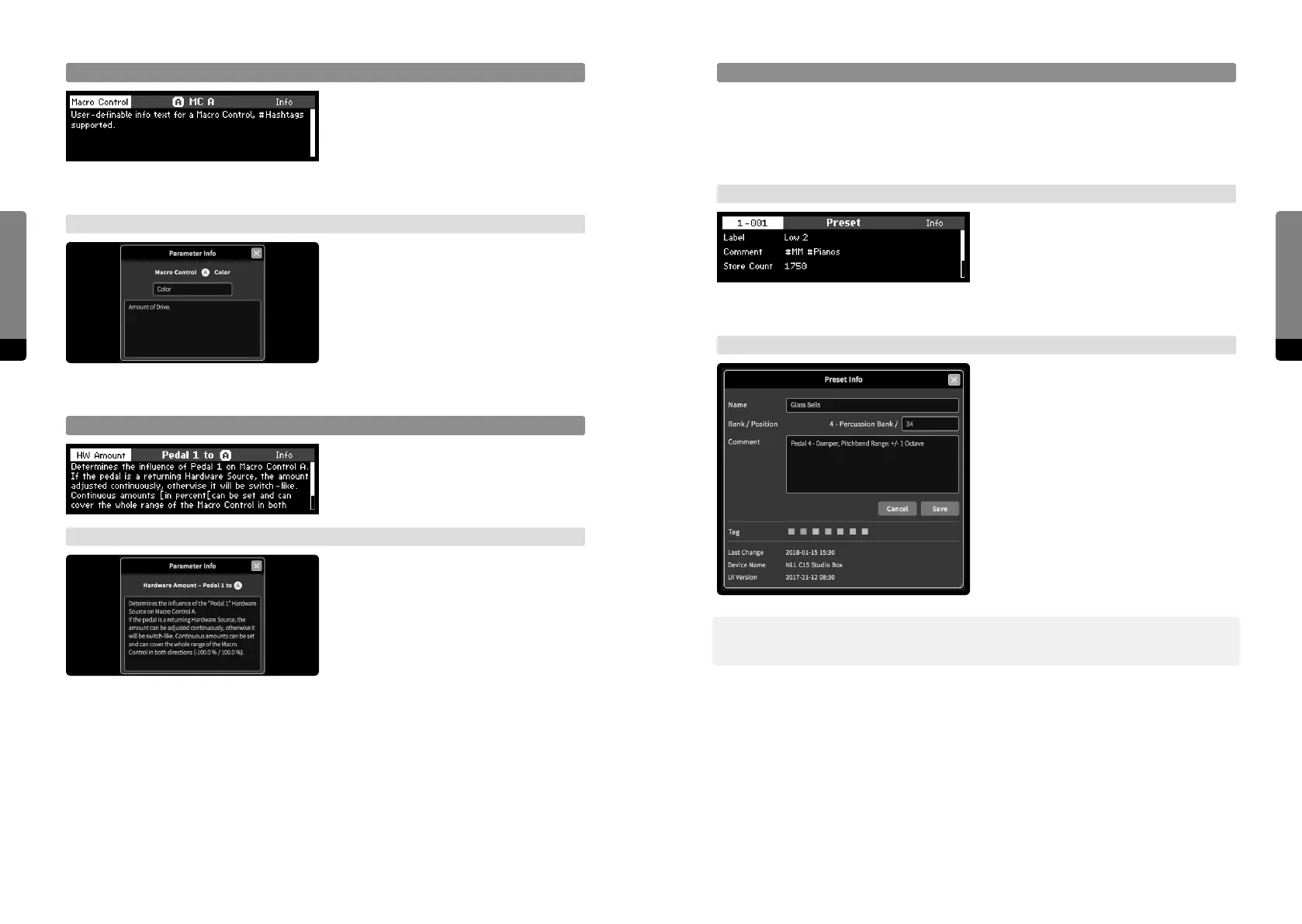 parent bank, the preset name, a comment text, a color tag and information about the last
