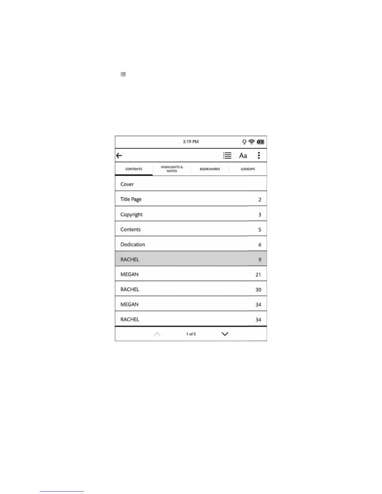 Tap on the Contents icon ( ) in the Reading Tools to open a window with four tabs:
