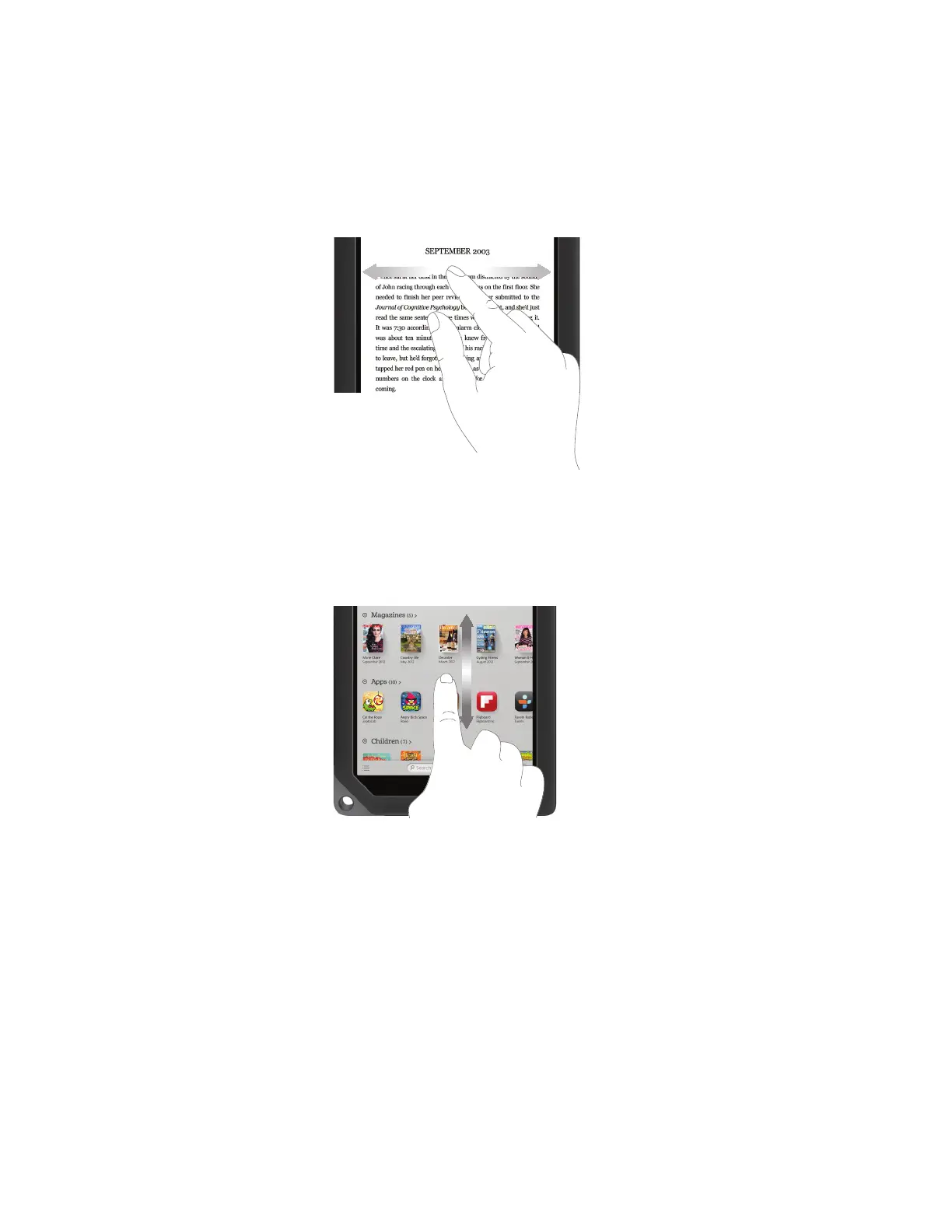 You’ll typically swipe to scroll through a long list or collection things, such as the row of books and other items on the