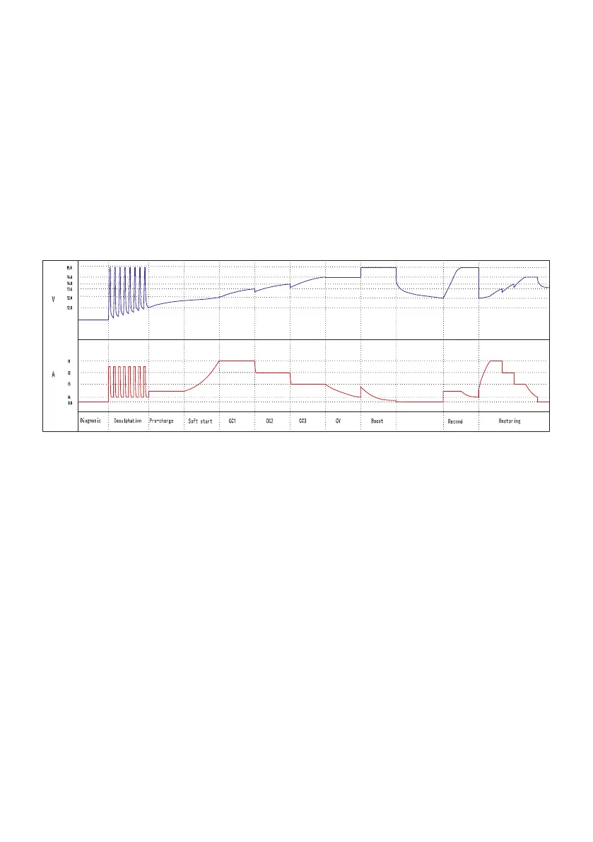 la batería baja de los 12,8 V CC, el cargador se reiniciará desde la fase 4 hasta la fase 7.