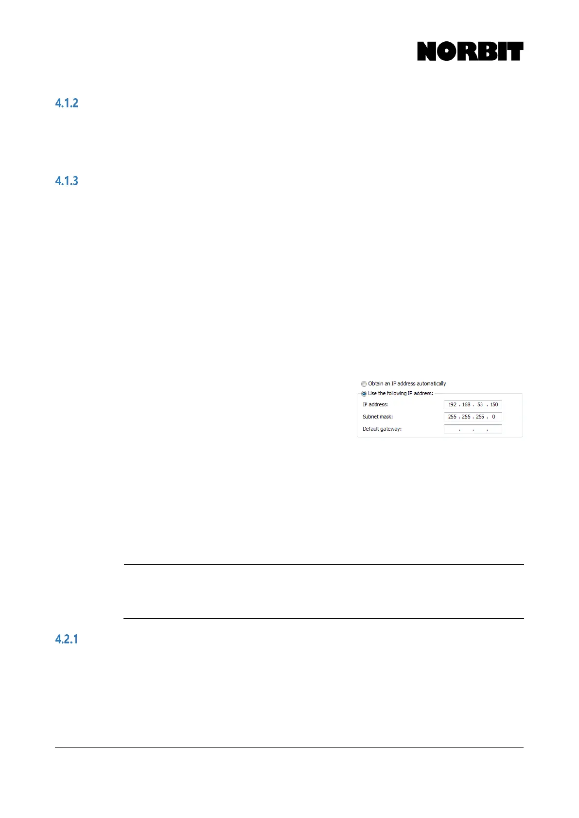 255.255.255.0 should be used. NORBIT recommends setting the IP address of the laptop/PC to