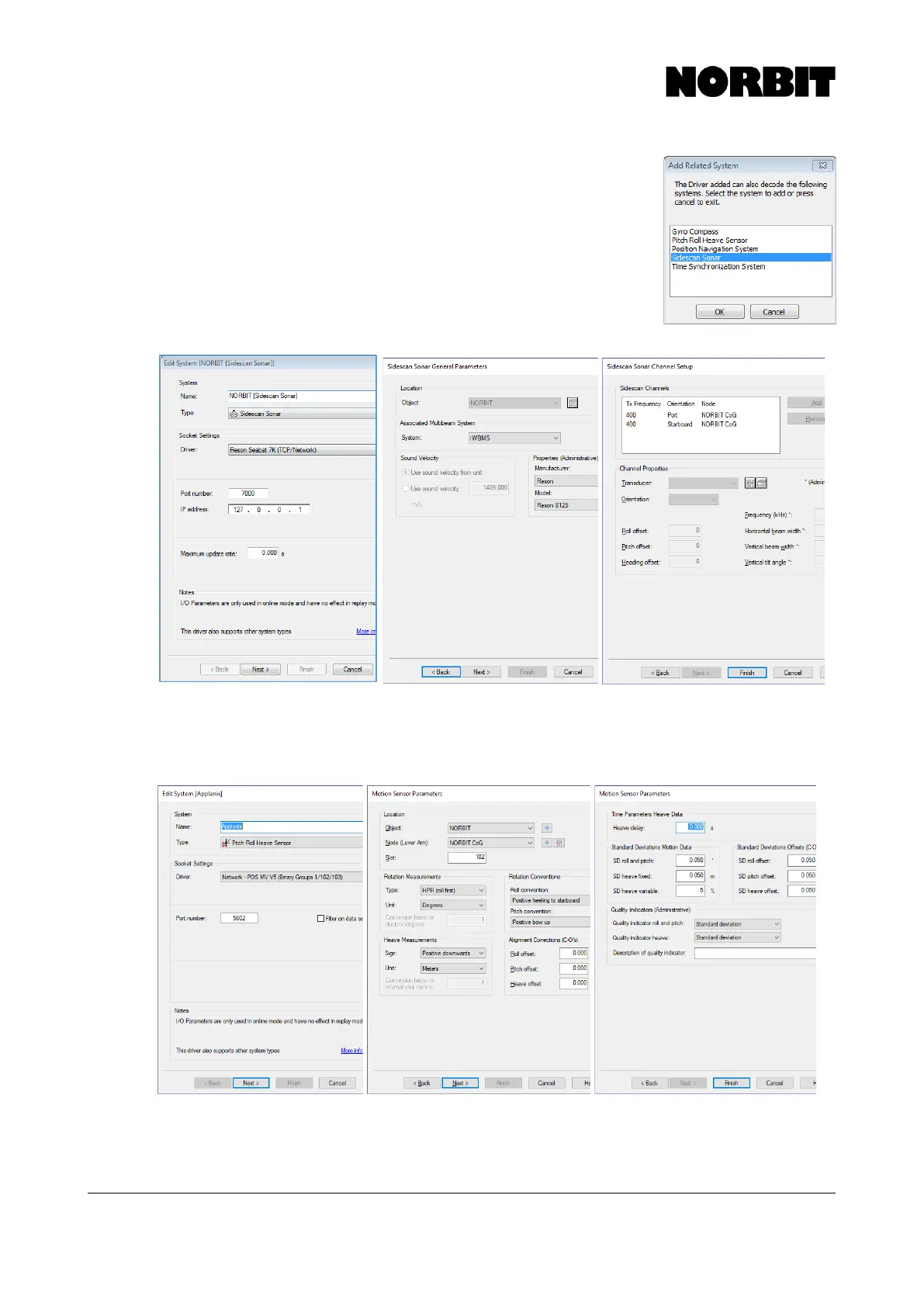 To set up the NORBIT side scan in QINSy configure the pages as shown