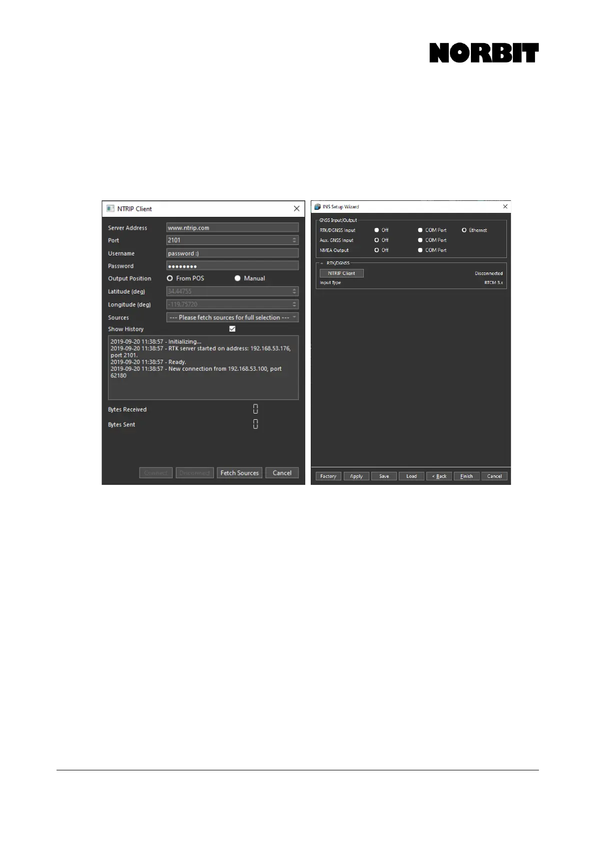 NTRIP Client. The connection status can be monitored on the INS status bar at the top of the GUI.