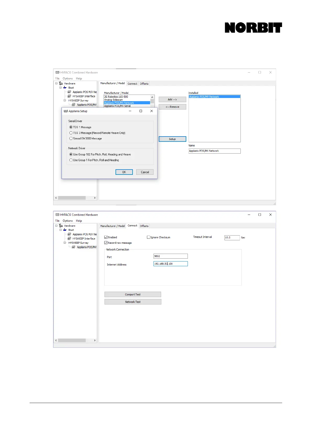 In HYSWEEP Survey, add the Applanix POS/MV Network device and configure it as shown below: