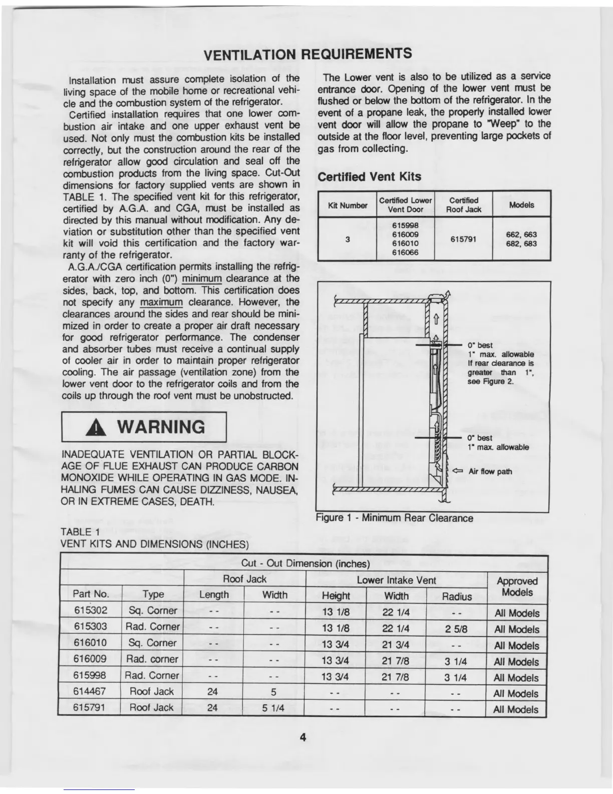 Norcold 663 - Ventilation and Installation Requirements; Certified Vent Kits and Dimensions
