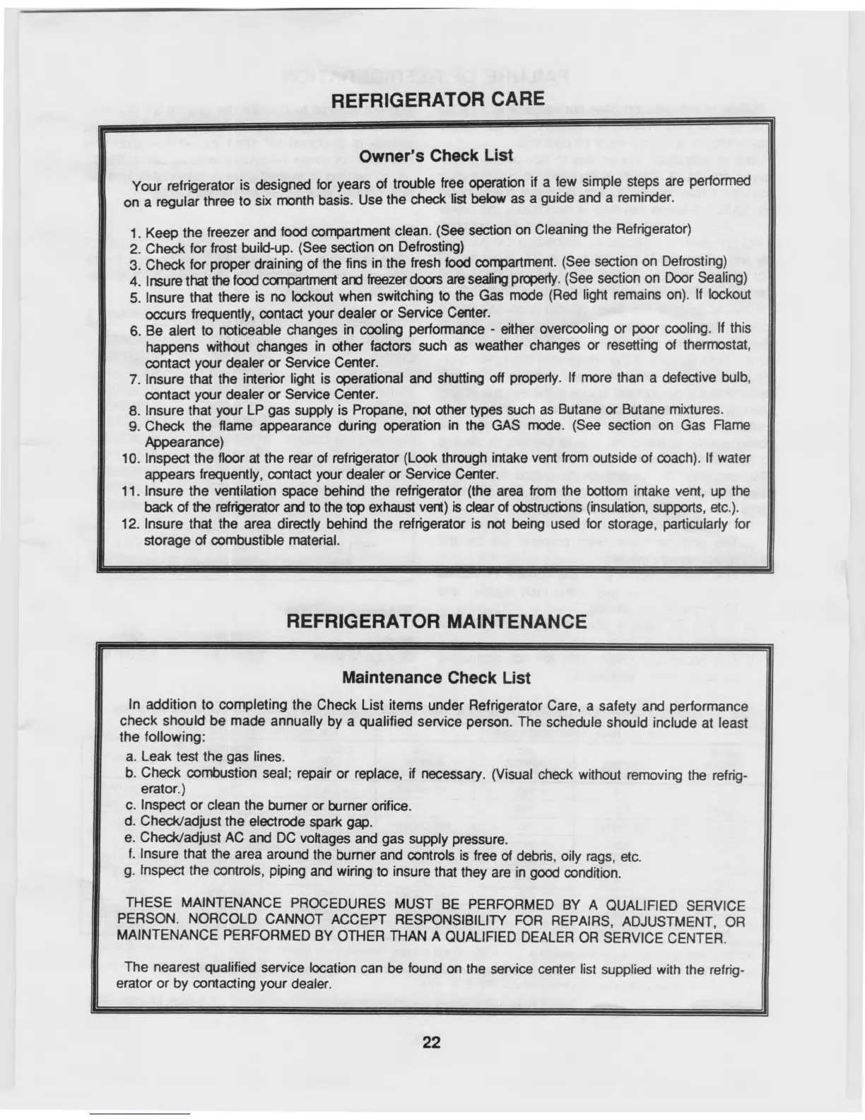Norcold 683 - FAILURE OF REFRIGERATION; Replacement Parts; Storage Volume